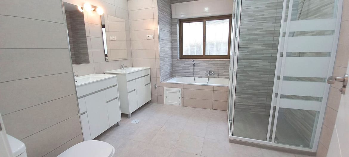 The entrance floor has a bright living room, a dining area and a fully equipped modern kitchen. Large sliding doors lead to the terraces. There is also a guest toilet. On the floor above there is a hall and two bedrooms, on the top floor there is a good-sized bedroom and an on-suite bathroom with a jacuzzi, shower and two sinks. The basement floor has one bedroom, for example for guests, and a two-car garage.