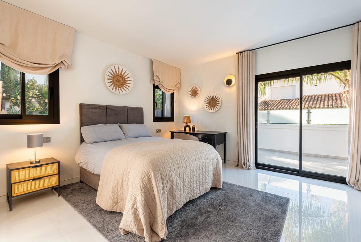One of the bedrooms has access to a very cozy terrace with space for lounge furniture and further access to the garden.