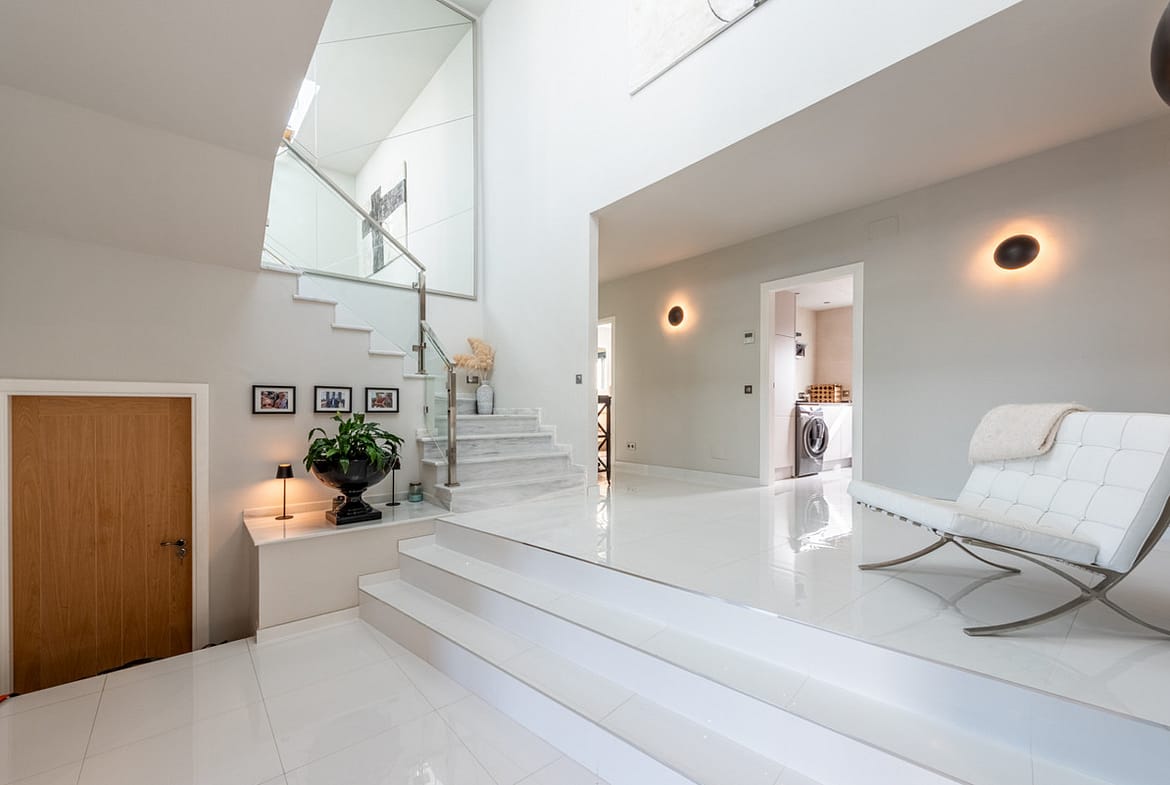 From here, you take the stairs up to the next level, where you also find the main entrance if you prefer to enter via the outdoor stairs from the driveway.