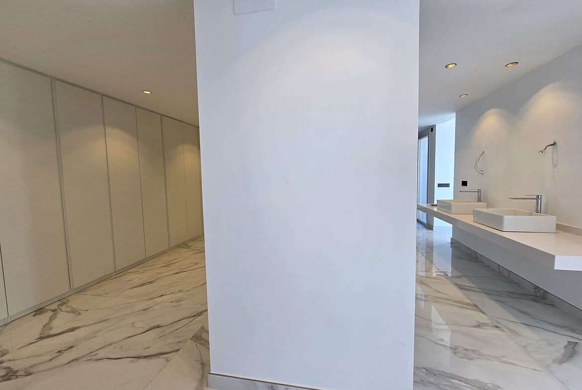 Built on a generous 2,389 m² plot with 297 m² of living space, the villa has been designed to flood interiors with natural light while seamlessly connecting indoor and outdoor living. The residence features four bedrooms, including two en-suite bathrooms, plus a family bathroom and guest toilet. The master suite boasts an impressive dressing room with fitted wardrobes, a designer bathroom, and direct access to the main terrace.