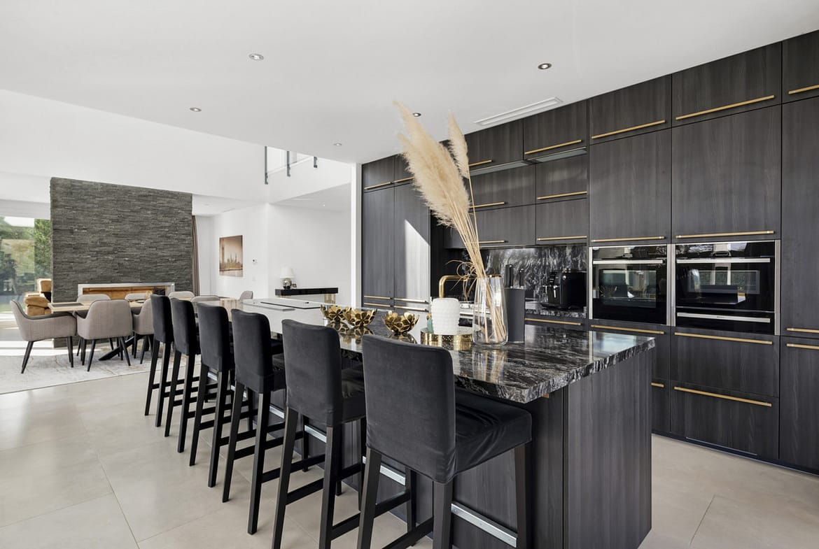 An impressive entrance hall with double-height ceilings welcomes you into the home, leading to a modern fully fitted kitchen equipped with premium appliances, a bright living area with fireplace, and a guest bedroom with an en-suite bathroom. Expansive terraces surround the entire house, seamlessly connecting indoor and outdoor living.