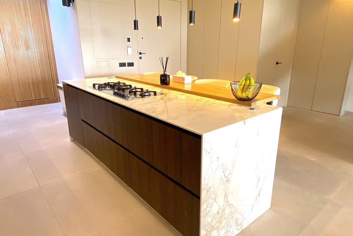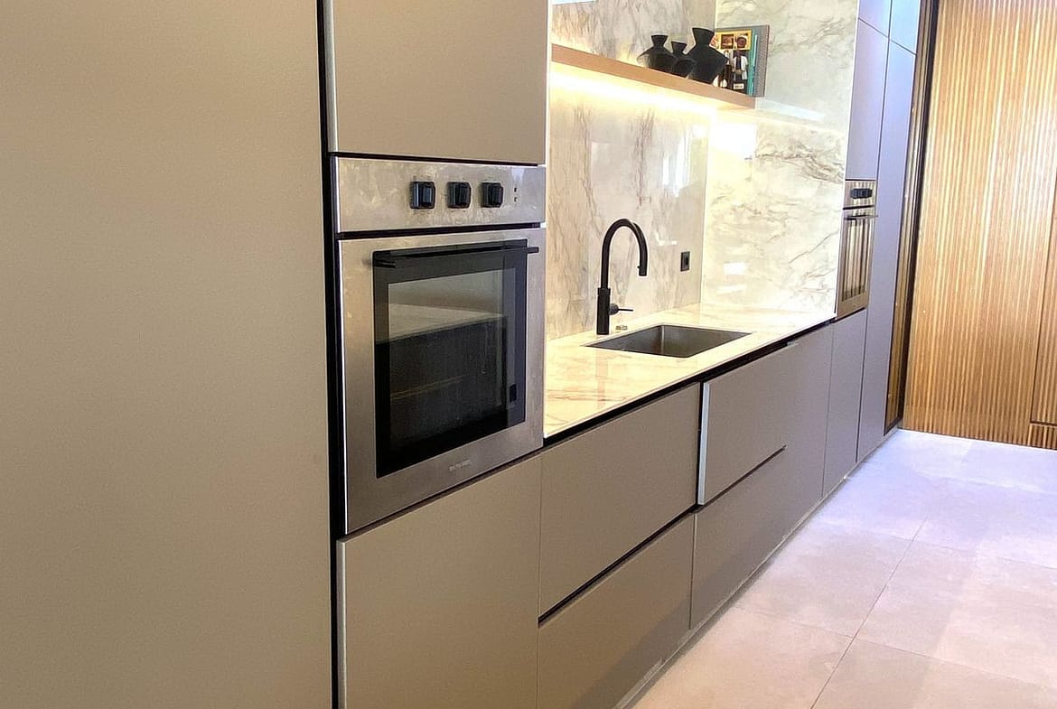 The townhouse is distributed over three levels and has been completely modernised. The entrance level features a welcoming hall leading to a bright open-plan living and dining area. The designer kitchen includes a central island and top-quality Barazza appliances, complemented by a separate utility and storage room.