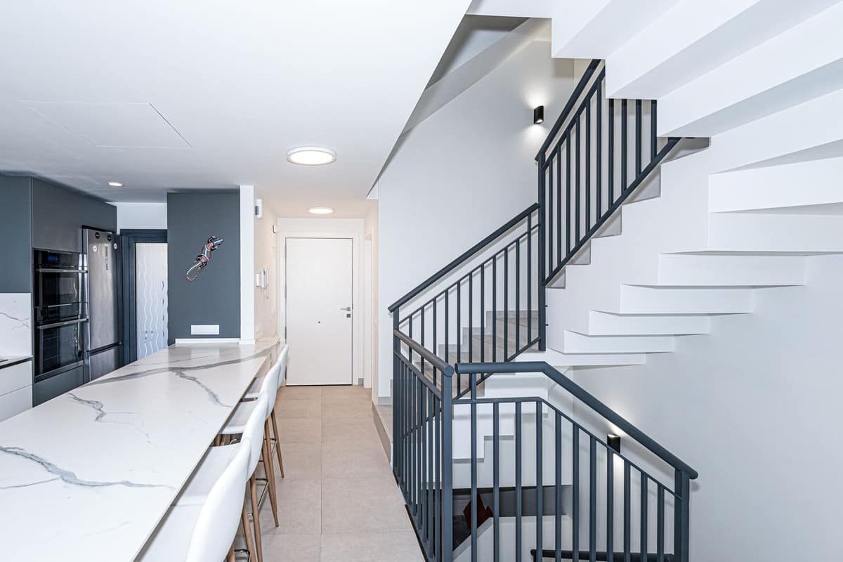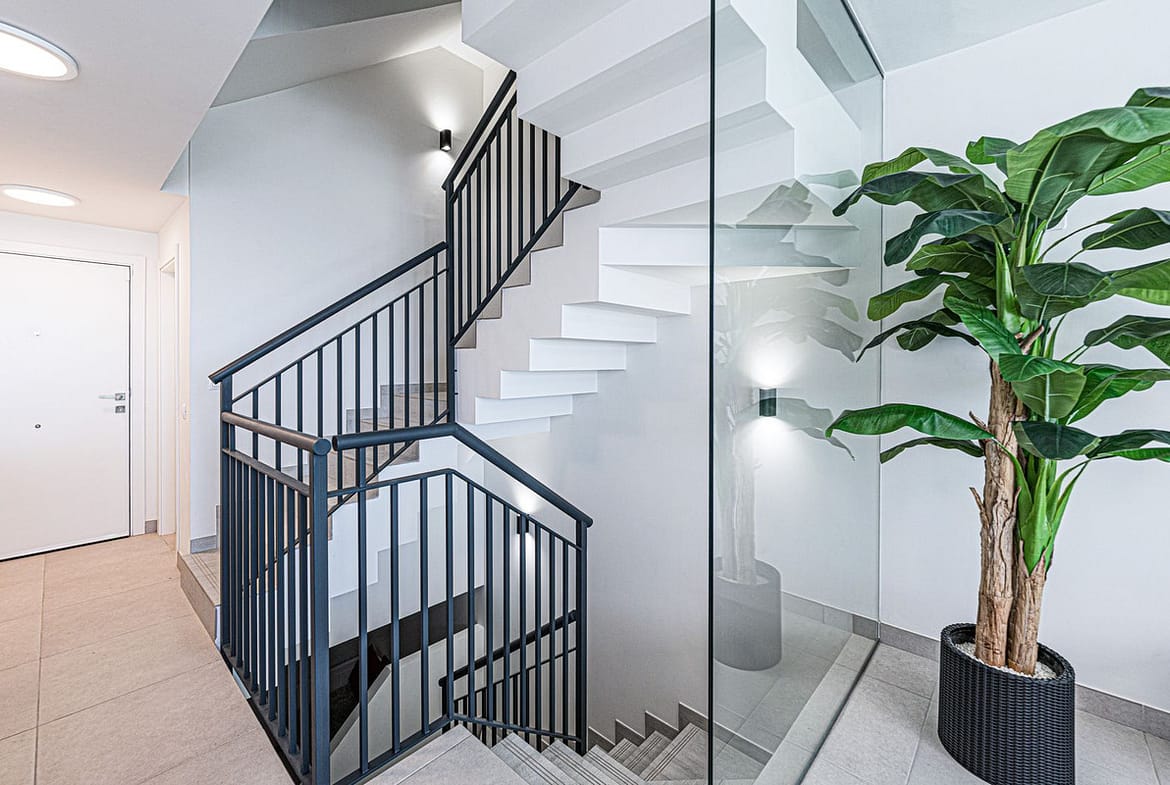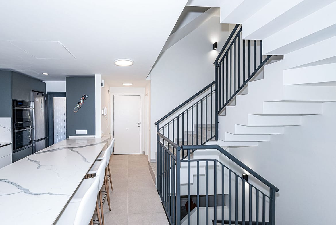 The first floor offers space for three bedrooms – a master bedroom with en-suite bathroom and two further bedrooms with a shared bathroom. A fourth bedroom is located on the top floor, including a bathroom and walk-in wardrobe. From here, you can access the roof terrace, which offers spectacular views of the sea and the whole coast.