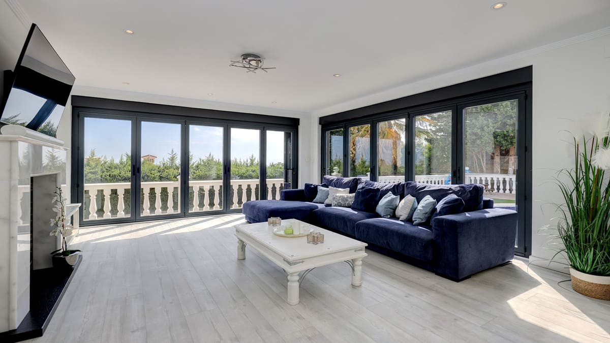 The bright and airy living area opens onto an extended conservatory-style terrace that captures sunlight from sunrise to sunset. It’s the perfect space to relax, dine al fresco, or entertain year-round while enjoying the views and natural light.