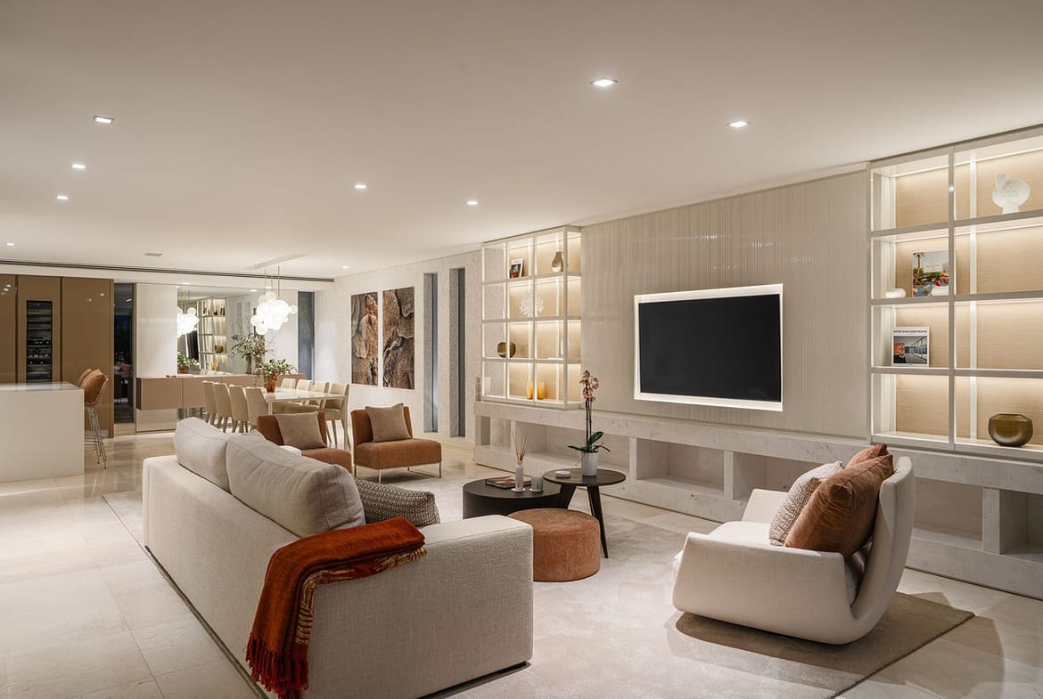 This is a house for people who value flow. The lower level handles leisure properly — entertainment room with bar, cinema area with projector, gym and sauna — so the living floors remain clean and composed. Upstairs, the kitchen, dining and living space opens directly onto the terrace, where the pool meets the line of the sea rather than competing with it. Light, proportion and modern design do the heavy lifting; nothing here asks for attention, yet everything earns it.