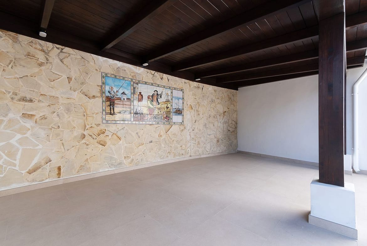 The house has two separate entrances, two covered parking spaces with a pergola, and a garage for one car