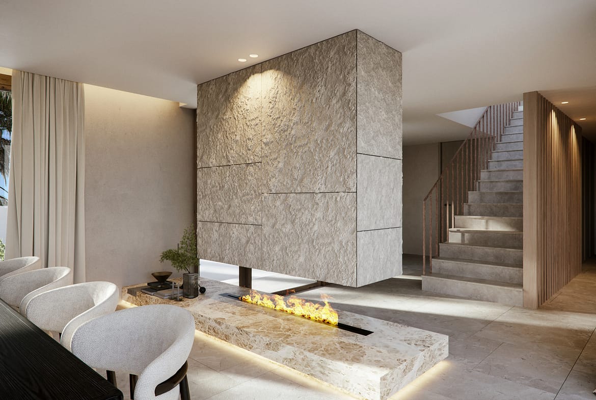 Each villa is thoughtfully designed with elegant white façades, natural stone details and expansive windows that flood the interiors with light. Open-plan living areas flow seamlessly onto generous terraces, landscaped gardens and private infinity pools, creating the perfect indoor-outdoor lifestyle.