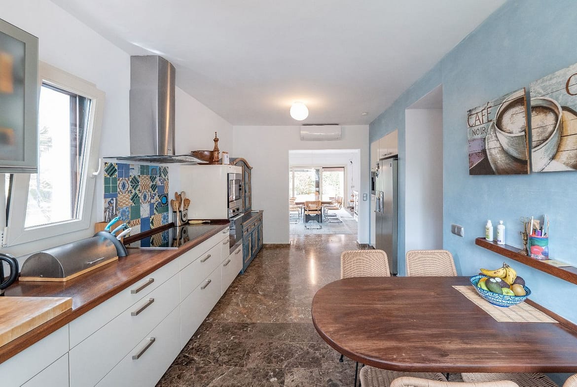 The fully equipped kitchen includes all necessary appliances, seamlessly connected to the dining area for effortless entertaining. The villa includes a separate laundry room with washing and drying machines, two boilers ensuring ample hot water supply, and a heated pool for year-round enjoyment.
