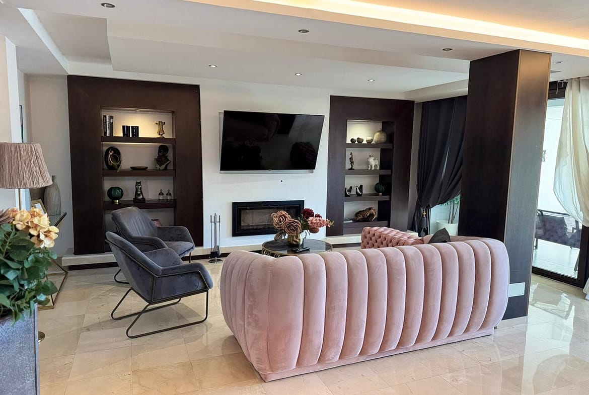 Outside, the villa boasts a private garden with a swimming pool, a chill-out area, and large terraces — perfect for enjoying the Mediterranean climate all year round.