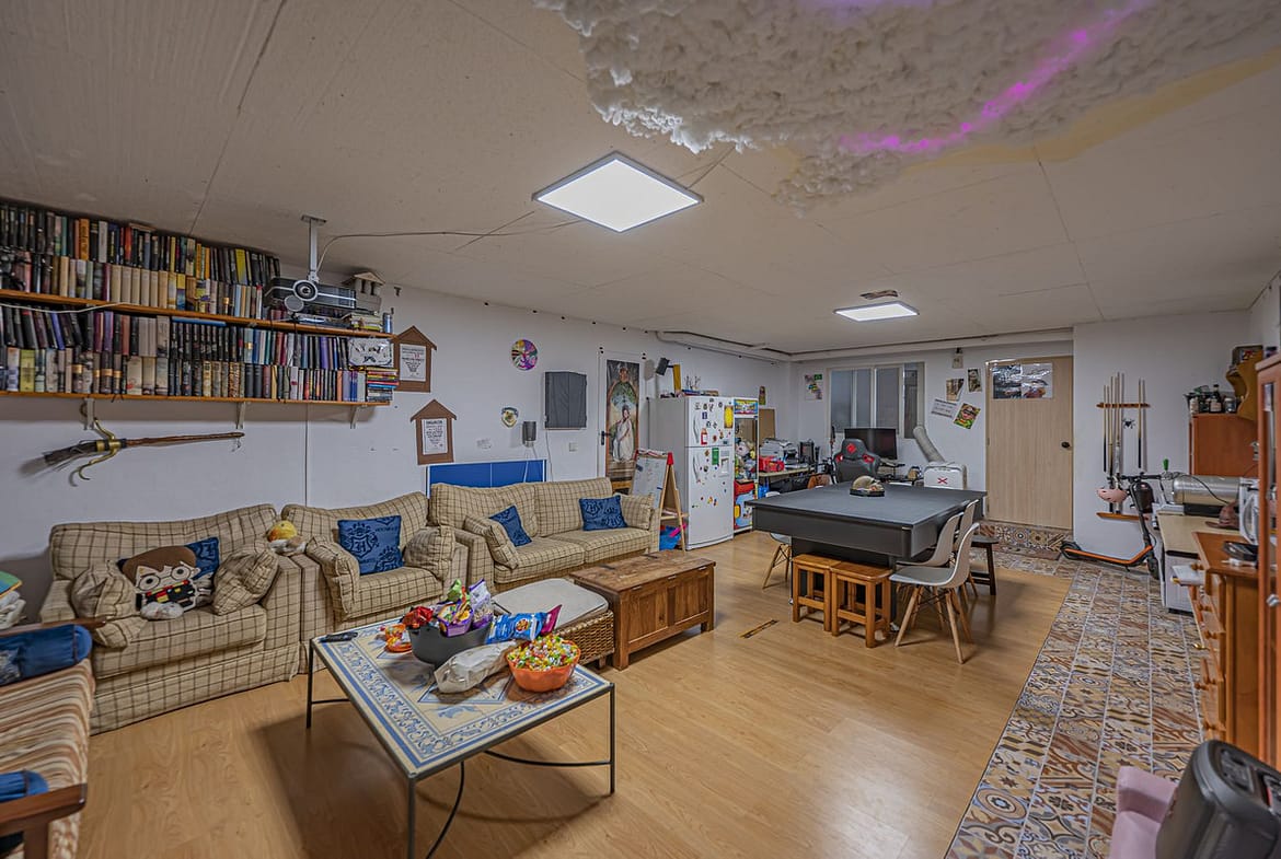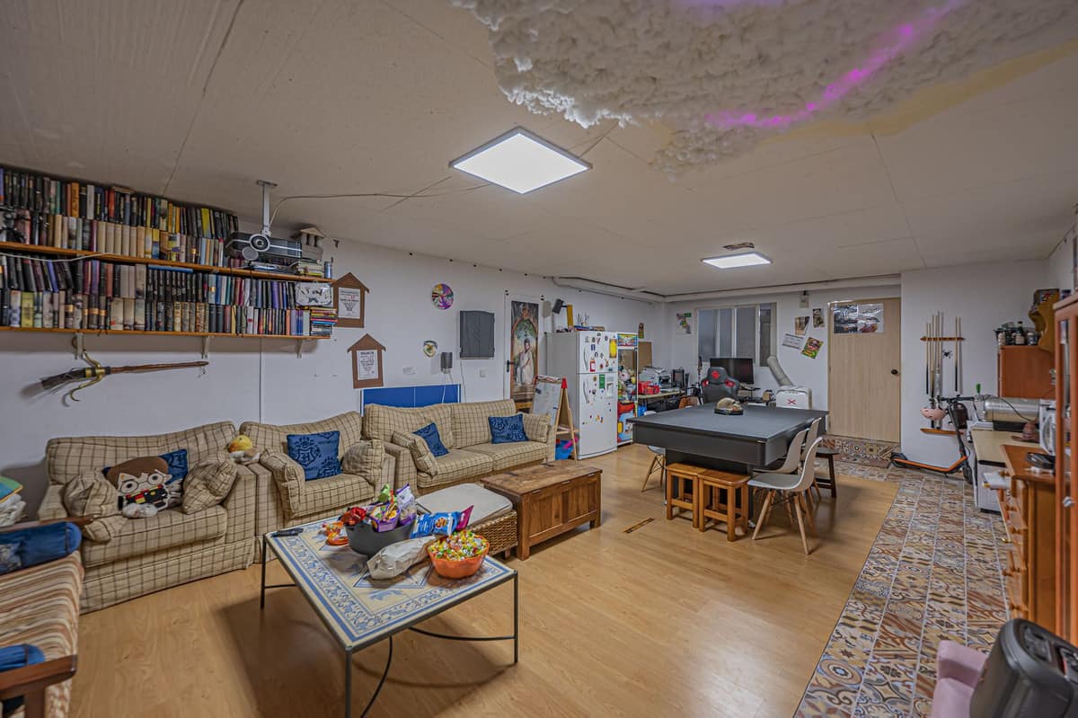 This spacious semi-detached house, distributed over several floors, offers a total of four bedrooms, three bathrooms plus a guest toilet, a living room with a fireplace and a separate kitchen, and a large basement with a cinema room, games room, etc.