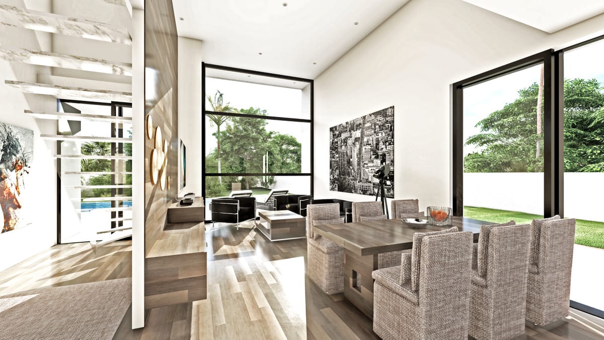 Design excellence and German-engineered quality — place it on your own plot or let us help you find the perfect one. This modern two-storey villa concept offers elegant, contemporary living with a bright open-plan layout. The design features a modern façade and a double-height living area with expansive windows that bring in abundant natural light and connect seamlessly to the outdoor terrace and pool area.