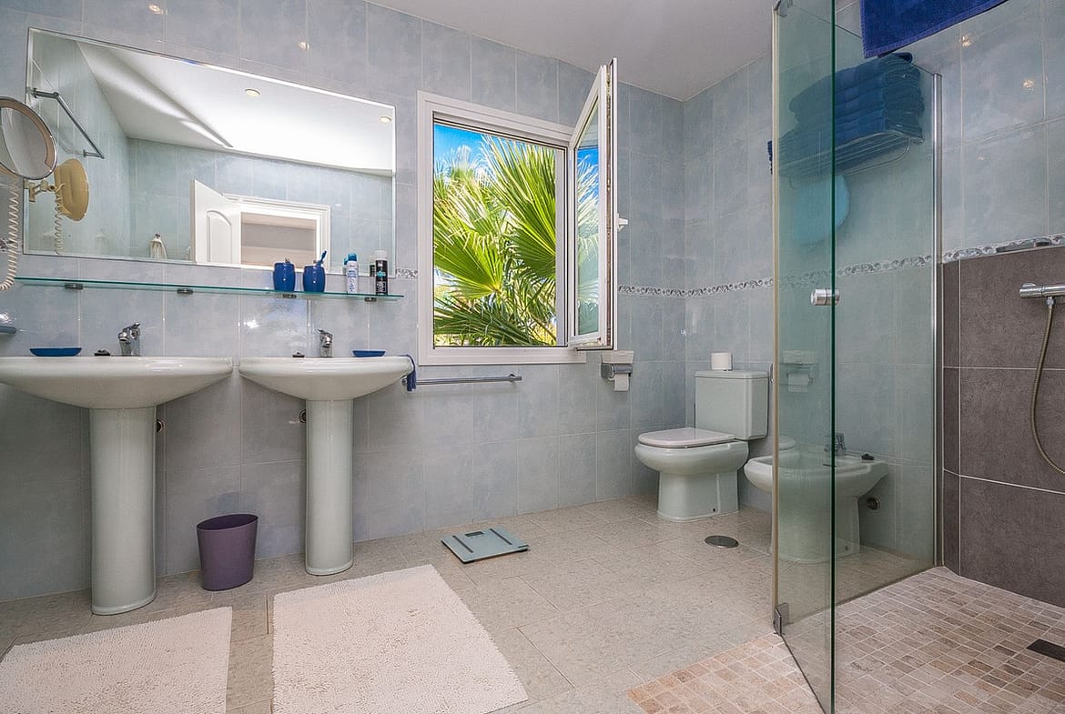 Boasting a desirable south-west orientation, the property enjoys sunshine throughout the day, creating bright and inviting living spaces. It is built across two levels and is nestled on a plot of 809 square meters. The total built area is 388 square meters. Upon entering, you are greeted by a grand entrance hall with a sweeping marble staircase. The upper level hosts three spacious bedrooms with built-in wardrobes and three bathrooms, providing both comfort and privacy. On the lower level, you will find an additional bedroom and bathroom, a large living room with fireplace, and a fully fitted kitchen that opens onto a stunning covered patio with glass curtains, perfect for year-round entertaining.
