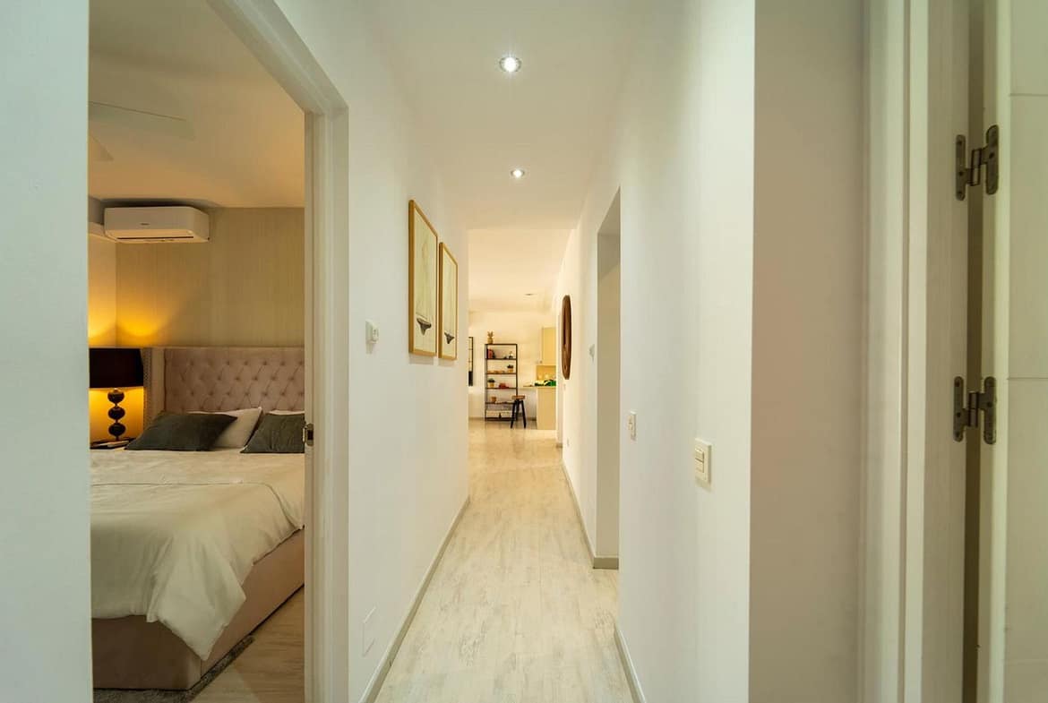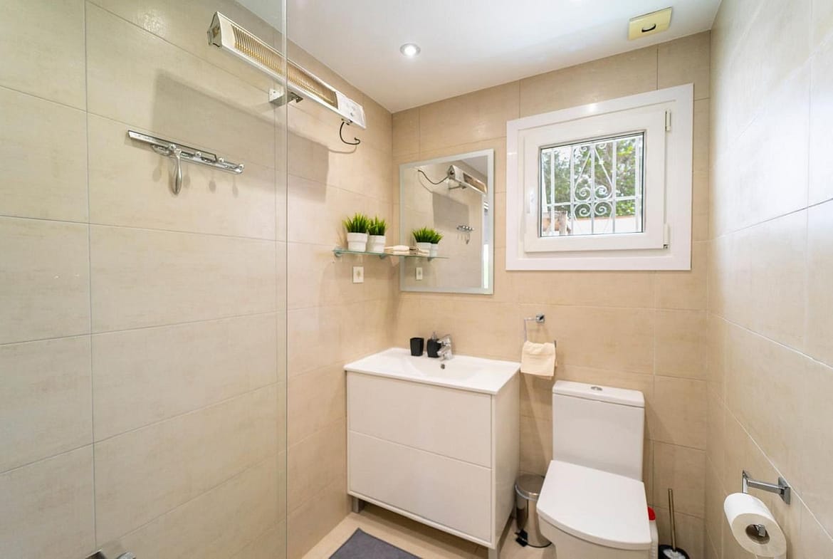 The master bedroom features an en-suite bathroom and direct access to the garden and pool area, providing a private retreat. Additionally, there is another bedroom with an en-suite bathroom, while the remaining two bedrooms share a full bathroom.