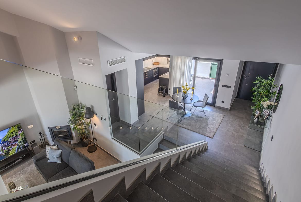 The open-plan living flows effortlessly onto a large south-facing terrace, partly covered for year-round enjoyment, with sweeping sea views and sunshine from morning to evening. High-quality finishes include air conditioning and underfloor heating throughout, ensuring comfort in every season.