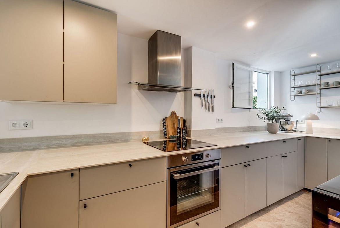 On the ground floor, you will find a fully renovated open-plan kitchen, spacious and modern, seamlessly connected to the living–dining area. From here, you can access a large rear terrace, perfect for outdoor dining, as well as a guest toilet. At the front of the house, there is a peaceful patio furnished with outdoor sofas—an ideal spot to relax.