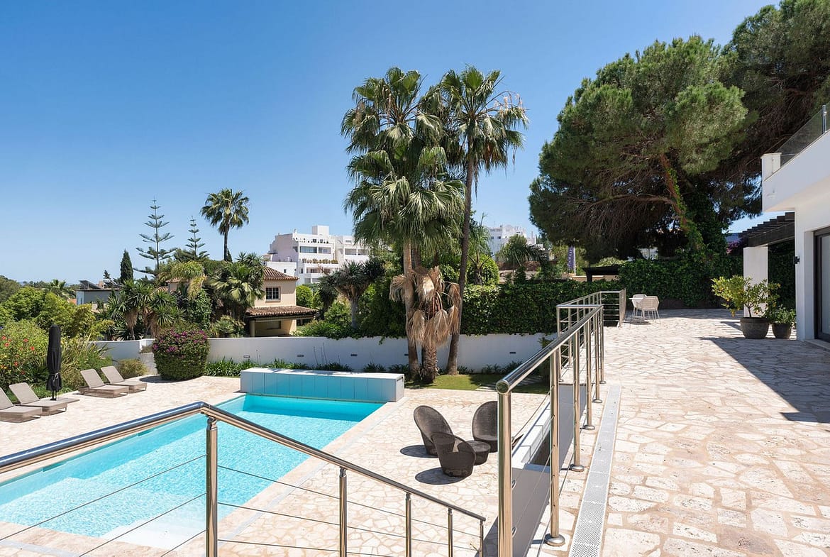 A contemporary villa located in the heart of Nueva Andalucia, within walking distance to amenities including supermarkets, restaurants and Centro Plaza Commercial Centre and just few minutes’ drive to the best golf courses in the area. This property has a South-East orientation with sun all day on the pool and stunning views of La Concha Mountain and towards the sea. Built over three floors, the main level features an open-plan design with spacious living areas leading directly out onto the large terrace with various seated areas ideal for entertaining, two guest bedrooms suites and a guest toilet. Upstairs is dedicated to the large master bedroom suite with dressing area and private terrace. On the lower level there is a further guest bedroom with ensuite bathroom, guest toilet and games room. The garden area is easily maintained and carport for up to 3 cars.