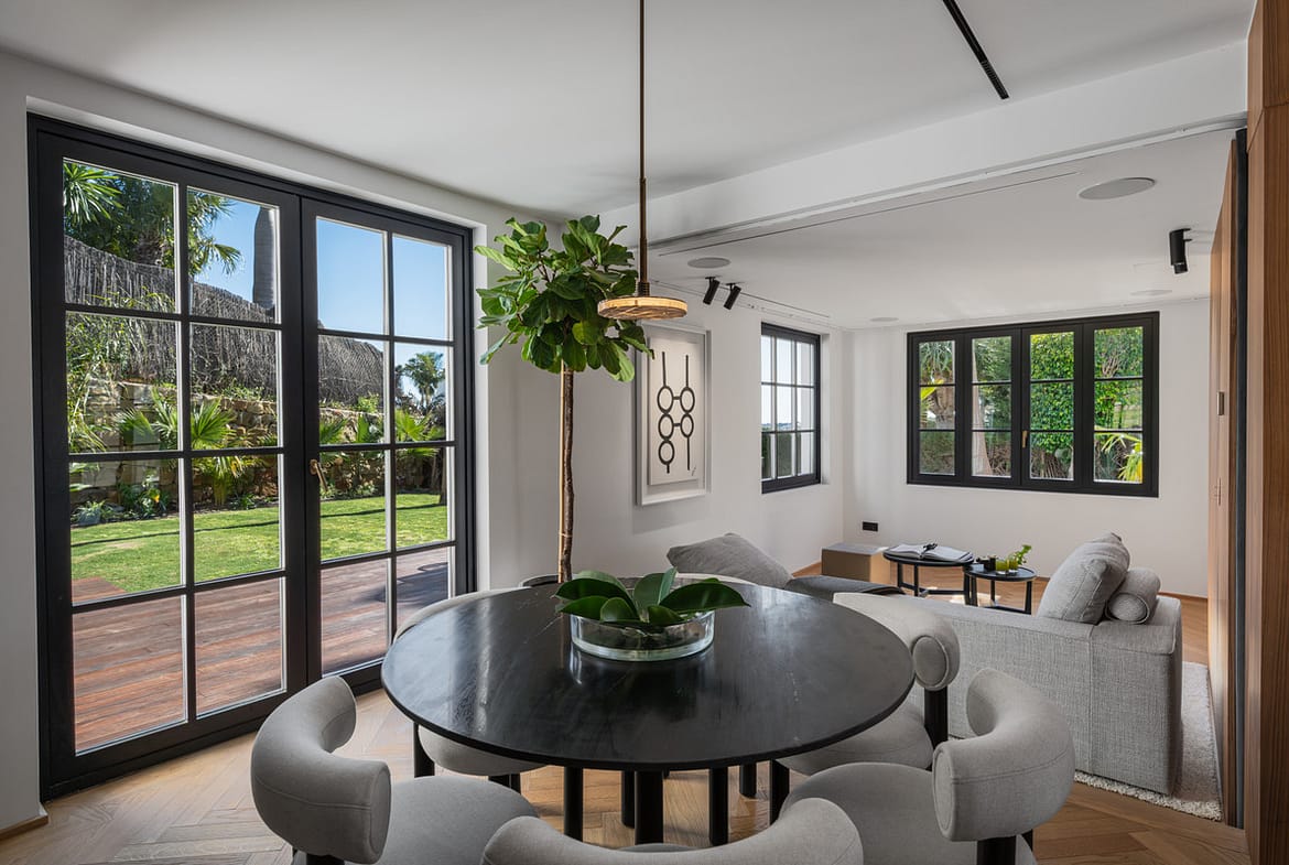 Upstairs, the principal suite benefits from vaulted timber ceilings, open dressing, sculptural stone basins and a walk-in marble shower. Full-height glazing frames the views to the golf and sea, while maintaining privacy. The additional bedrooms follow the same standard of finish and proportion, each thoughtfully designed to maximise comfort. Practical elements, such as a separate utility room, integrated wine storage, custom carpentry and layered lighting, are integrated discreetly throughout.