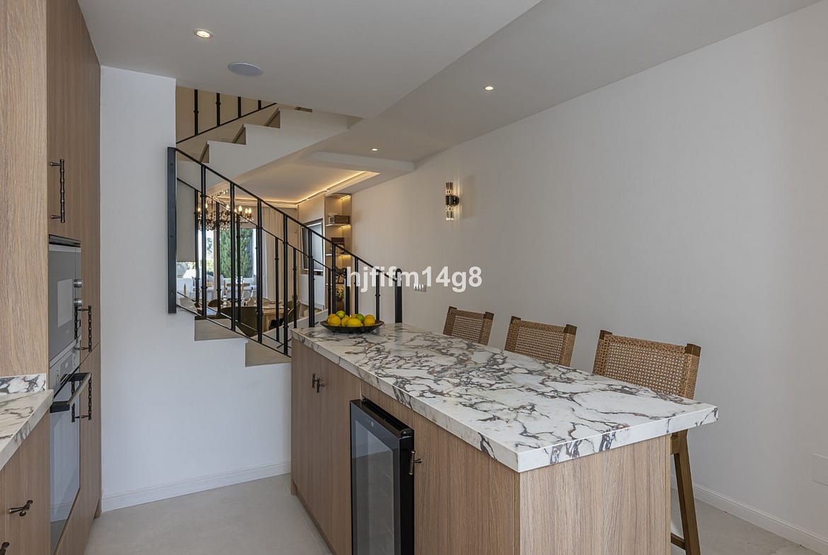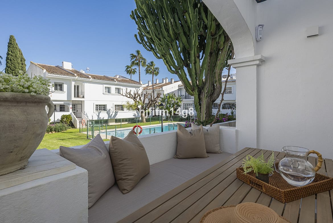 We are delighted to present this stunning, fully refurbished 4-bedroom townhouse located in the sought-after San Javier urbanisation in Nueva Andalucía, within the prestigious Marbella area. Set in a charming and very intimate residential community of just 28 properties, featuring beautifully landscaped gardens and a communal swimming pool, this home offers an ideal combination of comfort, style, privacy and prime location. Situated just behind Aloha Golf Course in a quiet cul-de-sac (not roadside), the property ensures calm and tranquillity while remaining within walking distance of restaurants, shops and the renowned Aloha College. Puerto Banús and the beaches are only a 5-minute drive away, with excellent connectivity to all local amenities.
