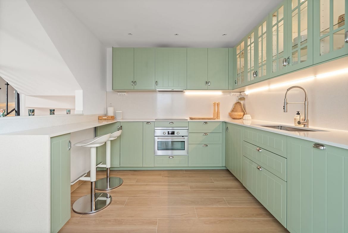 On the main floor, natural light fills the spacious living and dining area, which opens onto a lovely private terrace/garden of 34 m² – a perfect outdoor space to enjoy the Mediterranean climate. The independent new built kitchen has direct access to the living and dining room, a stylish bathroom with shower and laundry.