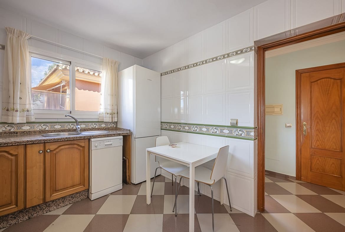 The main living area is located on the upper floor and stands out for its bright living room, which includes a dining area and access to a balcony. From here, there is access to a large terrace, perfect for enjoying the outdoors. The kitchen is independent and is integrated into the living room through a breakfast bar, which creates a social and cosy atmosphere.