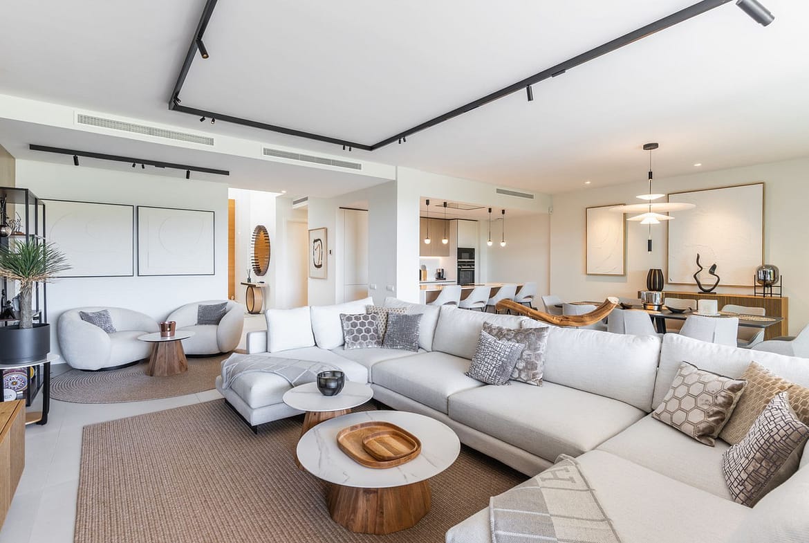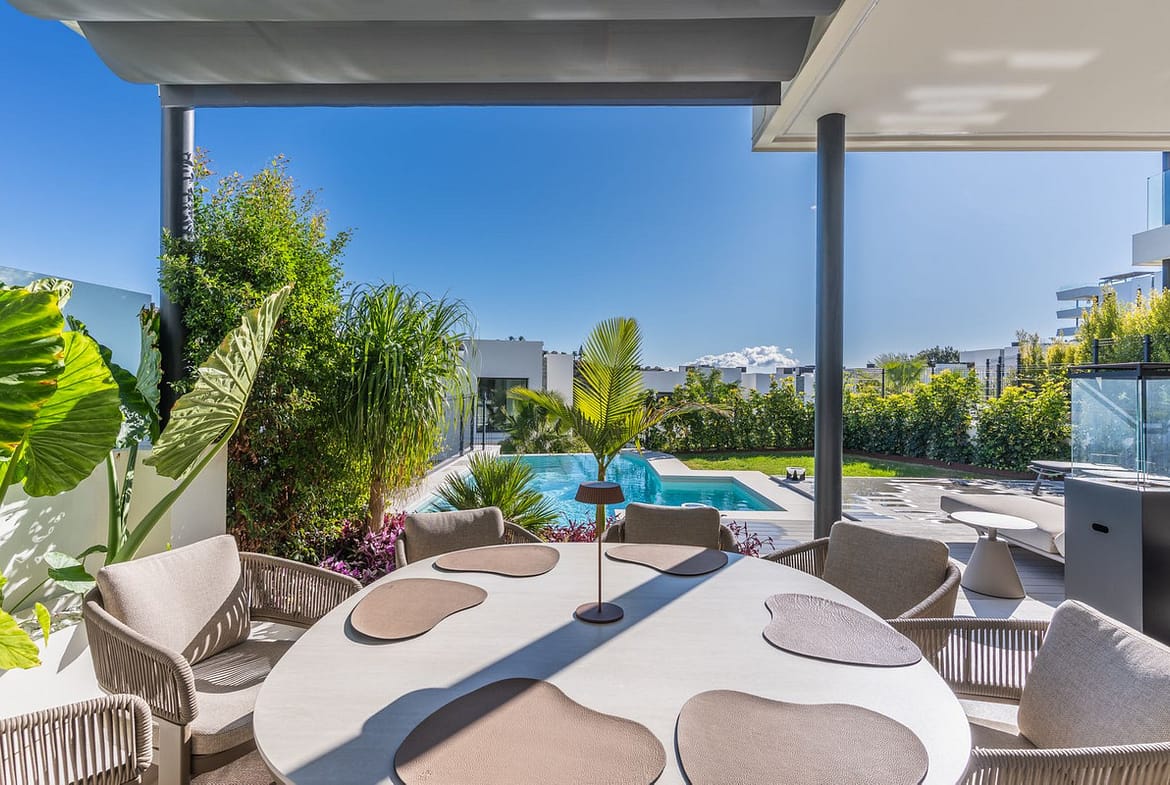 At the heart of the home is a bright open-plan living and dining area. Large windows lead directly to the terrace and private garden, allowing you to fully enjoy natural light and the Mediterranean climate all year round.