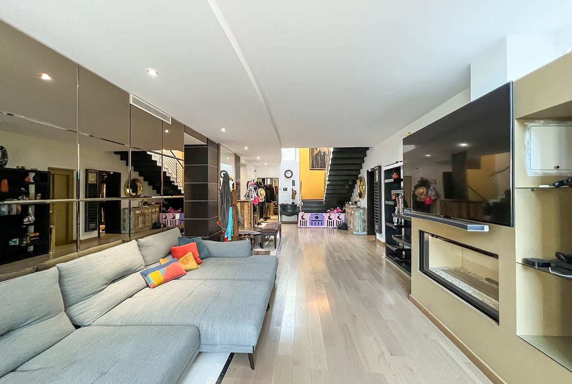 The house also features 3 terraces, one of which is a rooftop terrace of 166 m2 with solarium, Jacuzzi, BBQ, alfresco dining, and relaxing areas. It has a private infinity pool and garden, as well as a basement with storage room, laundry, garage for three cars, and a “smart house” system that can be controlled from an iPad. The property is fully furnished and decorated with contemporary, high-quality amenities.