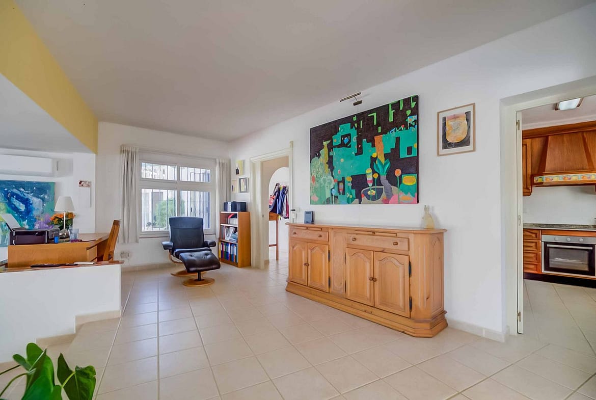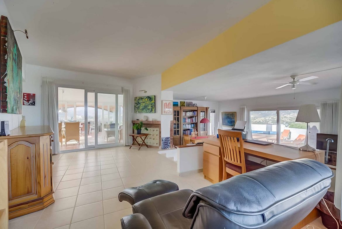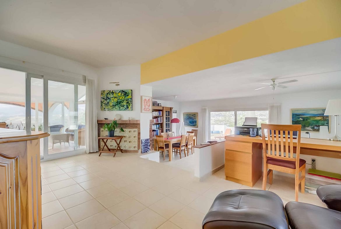 Inside, the house impresses with its large living room with a small level difference, combining a cozy reading area with desk, a seating area with fireplace, dining area, and separate kitchen, all flooded with natural light thanks to its large windows.