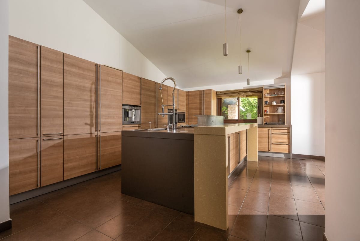 As you enter the villa, you're greeted by a welcoming entrance hall that seamlessly flows into a spacious living room. Adjacent is a fully equipped Bulthaup kitchen with state-of-the-art Gaggenau appliances, perfect for culinary enthusiasts. Both the living room and kitchen have direct access to a charming terrace and a beautifully landscaped garden with a pool, creating an idyllic space for relaxation and entertaining.