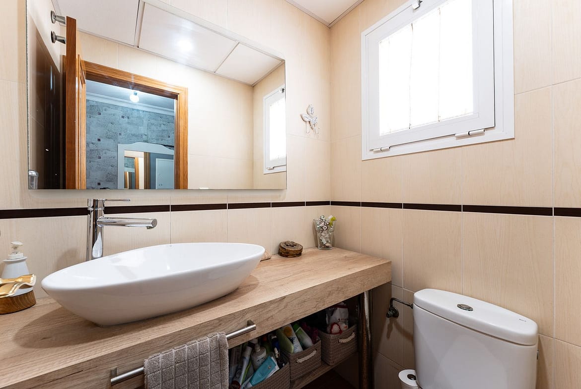 The property offers open views and generous space for comfortable family living. From the street, you enter through a large private area, ideal for parking two cars and creating a welcoming patio. Inside, the entrance leads to a guest toilet, a bright open-plan living and dining area, and a well-maintained kitchen with access to a cozy terrace.