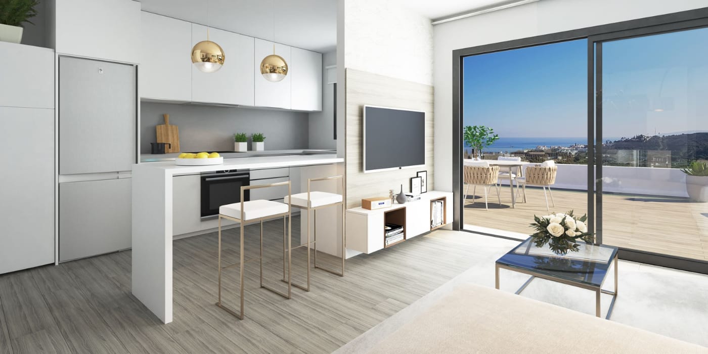 Contemporary design, convenience and quality, it’s all about living the Spanish dream. Very large windows invite natural light to flood into the open plan living room and kitchen.