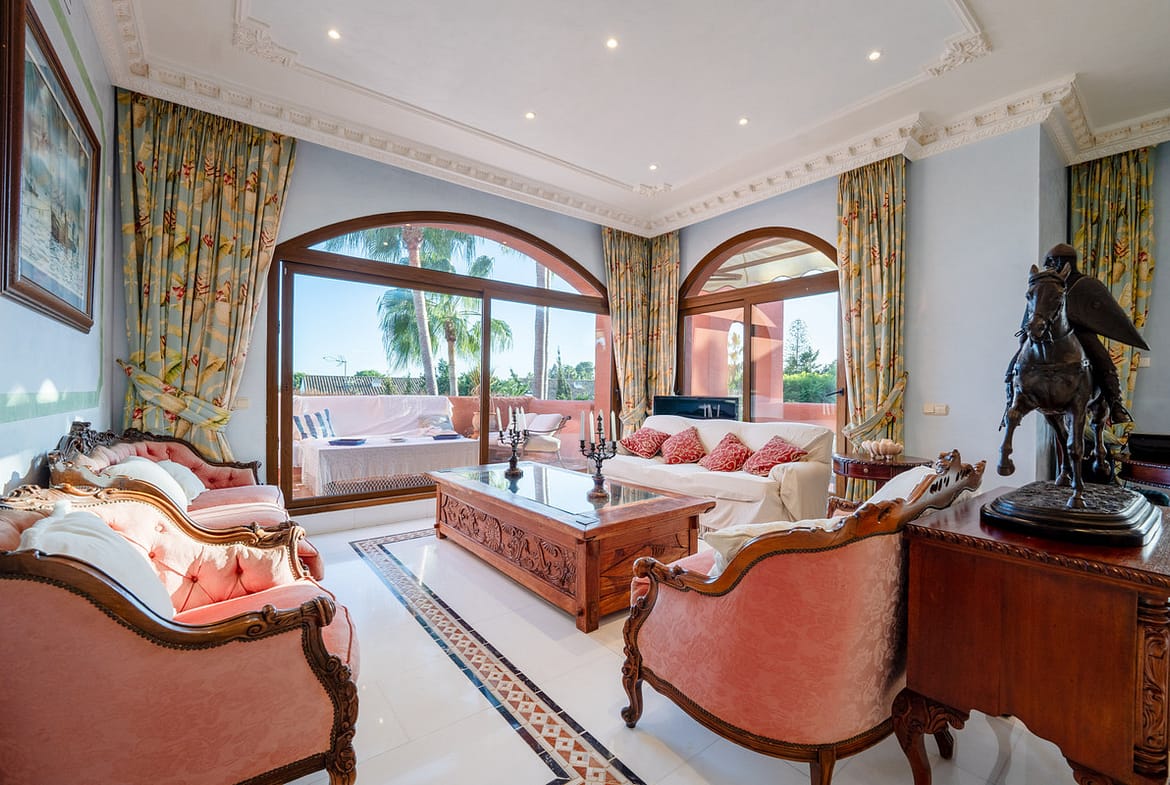 Penthouse Alhambra is a stunning duplex with private lift access in one of Guadalmina Baja’s most exclusive beachside communities. The residence features grand living areas filled with natural light from floor-to-ceiling windows and direct access to a wraparound terrace with panoramic views of the sea, gardens and mountains. High ceilings, classical details and elegant finishes create a sense of space and luxury throughout.