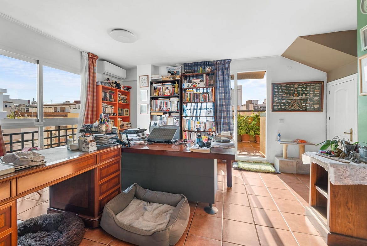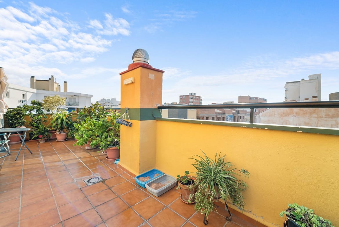 Big and cozy apartment in the center of Malaga city just a brisk 7 min walk down to the beach and 30 minutes to the center. This apartment located on the last floor of the building is a duplex with lots of space and natural light. We actually have 2 apartments in 1 as there has been an opening of a wall. First floor you have the kitchen and livingroom with access to a big terrace. This terrace gives us beautiful views and sun the whole day. On the same level we have access to the other apartment which have 3 good size bedrooms and a slightly bigger kitchen. On the second level, accessed by a stair in the entrance, we find 2 bedrooms and a bathroom. A nice little corner where you can setup your studio. This is a peculiar flat with its funny layout but it has a really good zen feeling to it and will easily fit a big family.