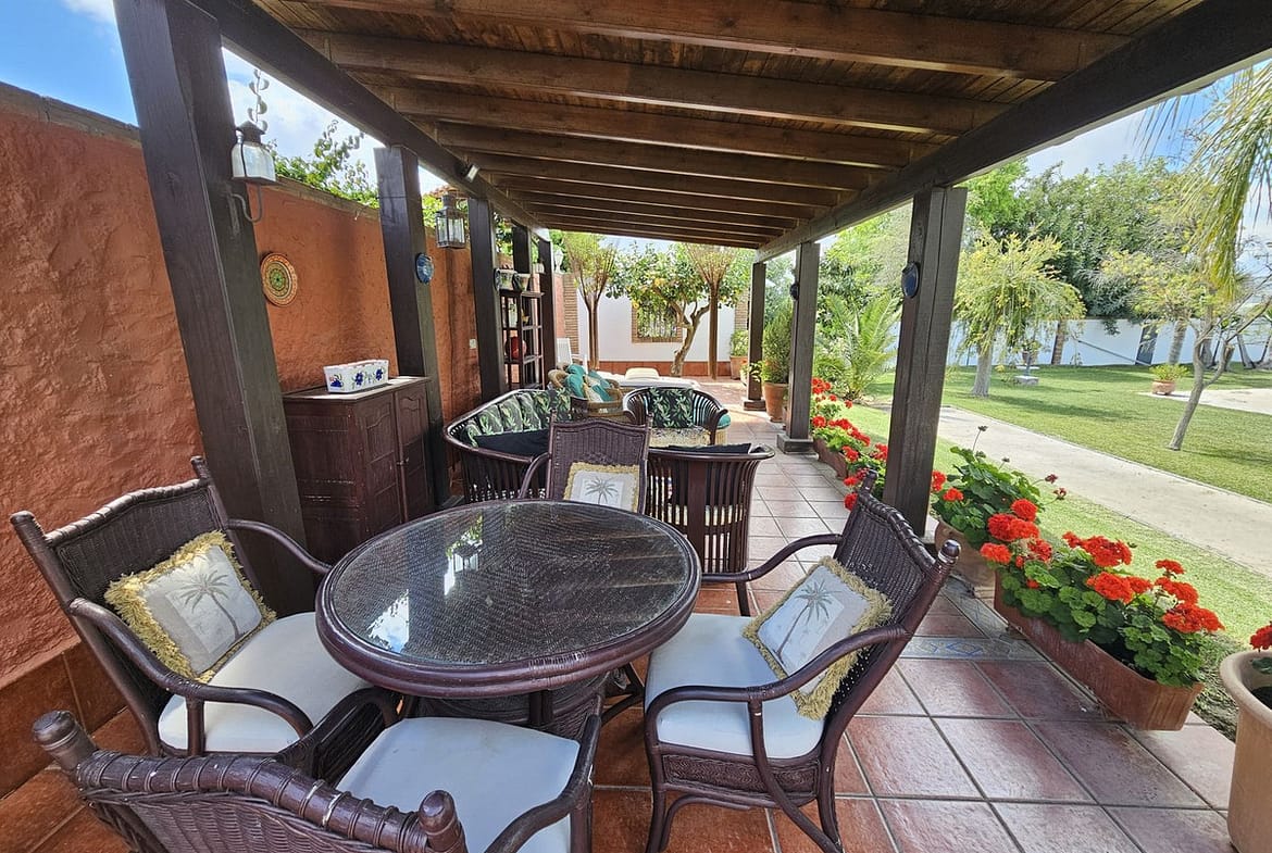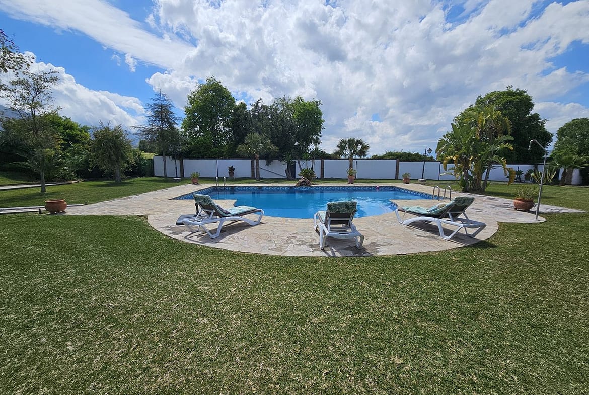 The main villa accommodates up to eight guests across three spacious en-suite bedrooms. Interiors are tastefully designed in a rustic-classical style, blending traditional charm with luxurious finishes. The elegant living and dining areas feature a large fireplace and expansive windows, flooding the space with natural light and framing beautiful garden views. A fully equipped kitchen opens onto an authentic Andalusian courtyard complete with a decorative fountain, offering a serene and stylish setting for private dining or quiet reflection.