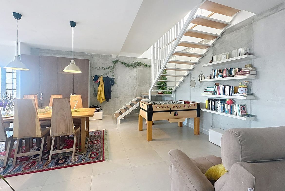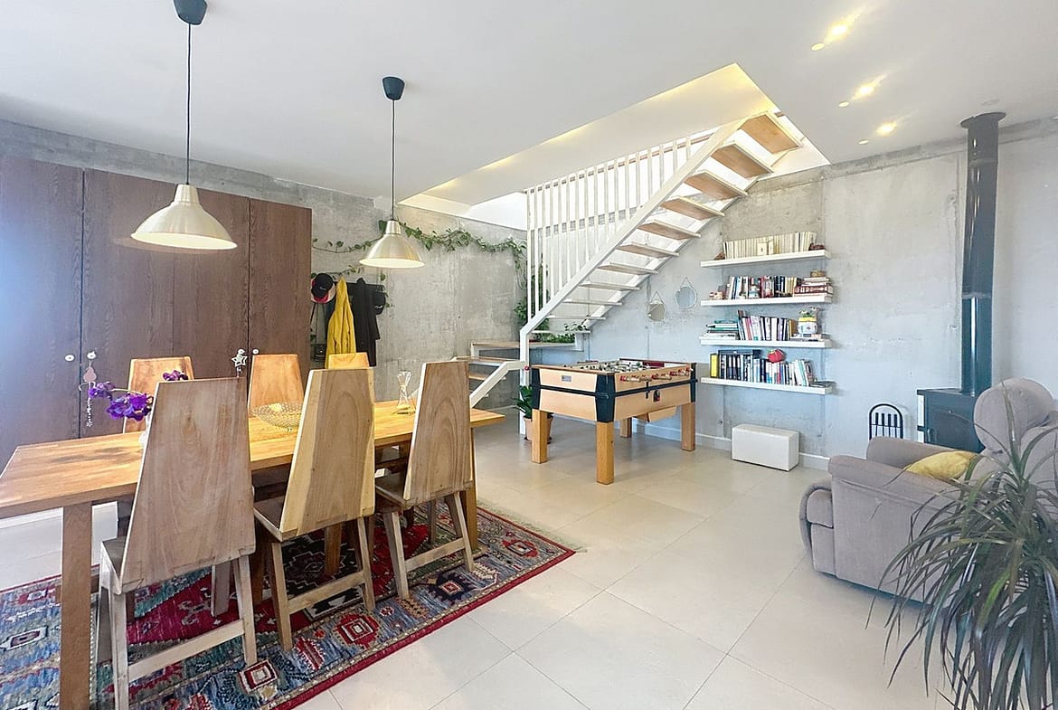 The interior combines the tough look of concrete walls with the warm touches of wood, creating a harmonious and modern living environment.