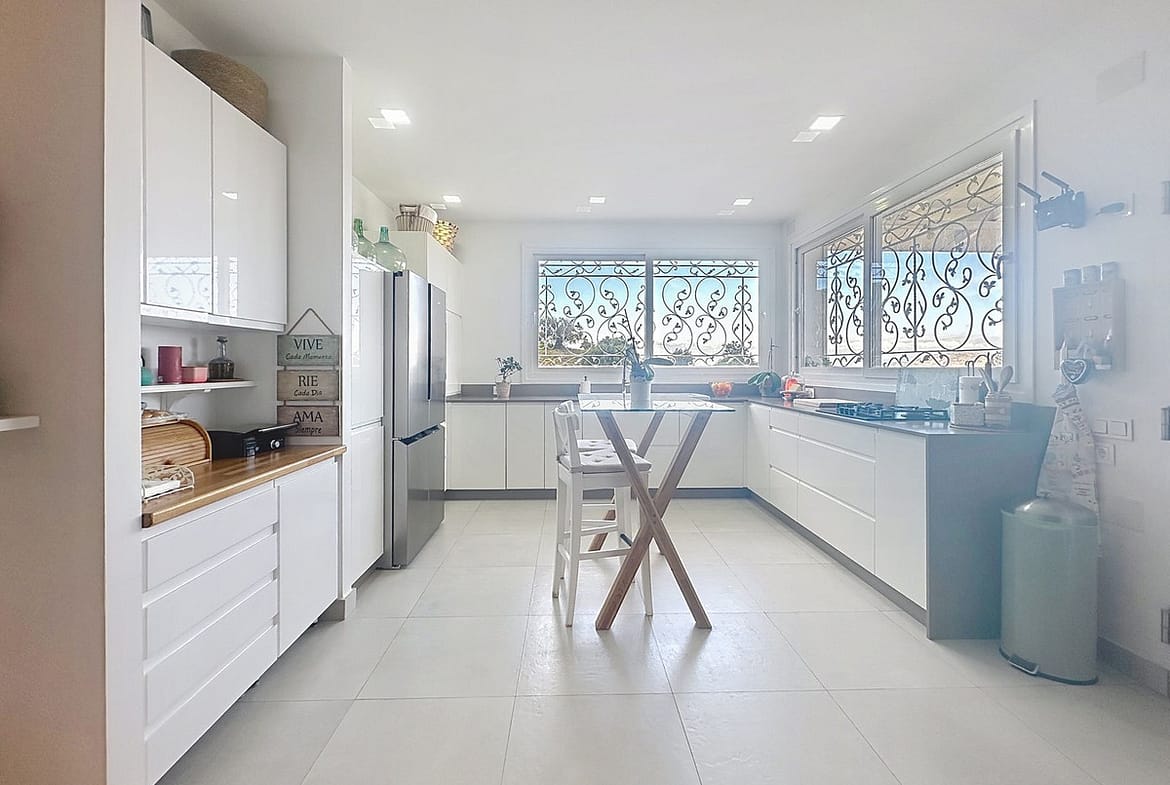 – Ground floor: An open, bright kitchen with large windows and worktops, fully equipped with modern appliances. Adjacent you will find a cosy living/dining room with wood-burning stove, a guest toilet/laundry room and a spacious storage room. The living room gives access to a large covered terrace with a private pool, barbecue area and panoramic views.