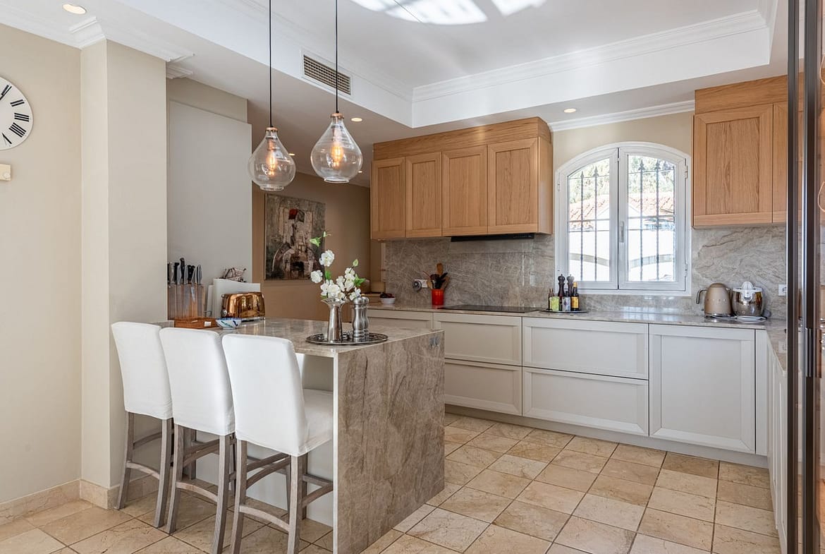 With nearly 700m2 of south-facing interior space, the home is thoughtfully designed for relaxed living and entertaining. Five en-suite bedrooms, expandable to six, are complemented by bright open-plan living areas, a home cinema, and a games room. Outdoor spaces feature a poolside bar, barbecue area, and expansive terraces for year-round enjoyment. The architecture reflects classic andalusian style, with a romantic central patio, whitewashed walls, blue shutters, and a layout that balances family comfort with refined hosting areas.