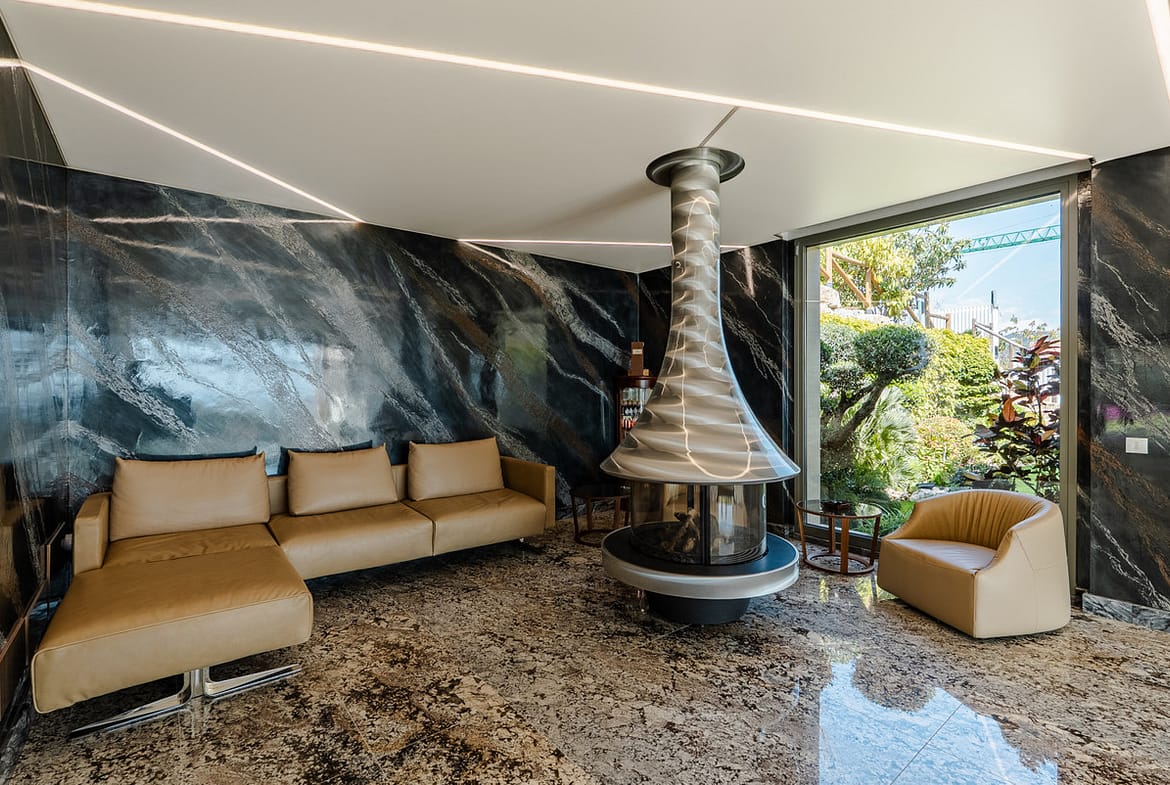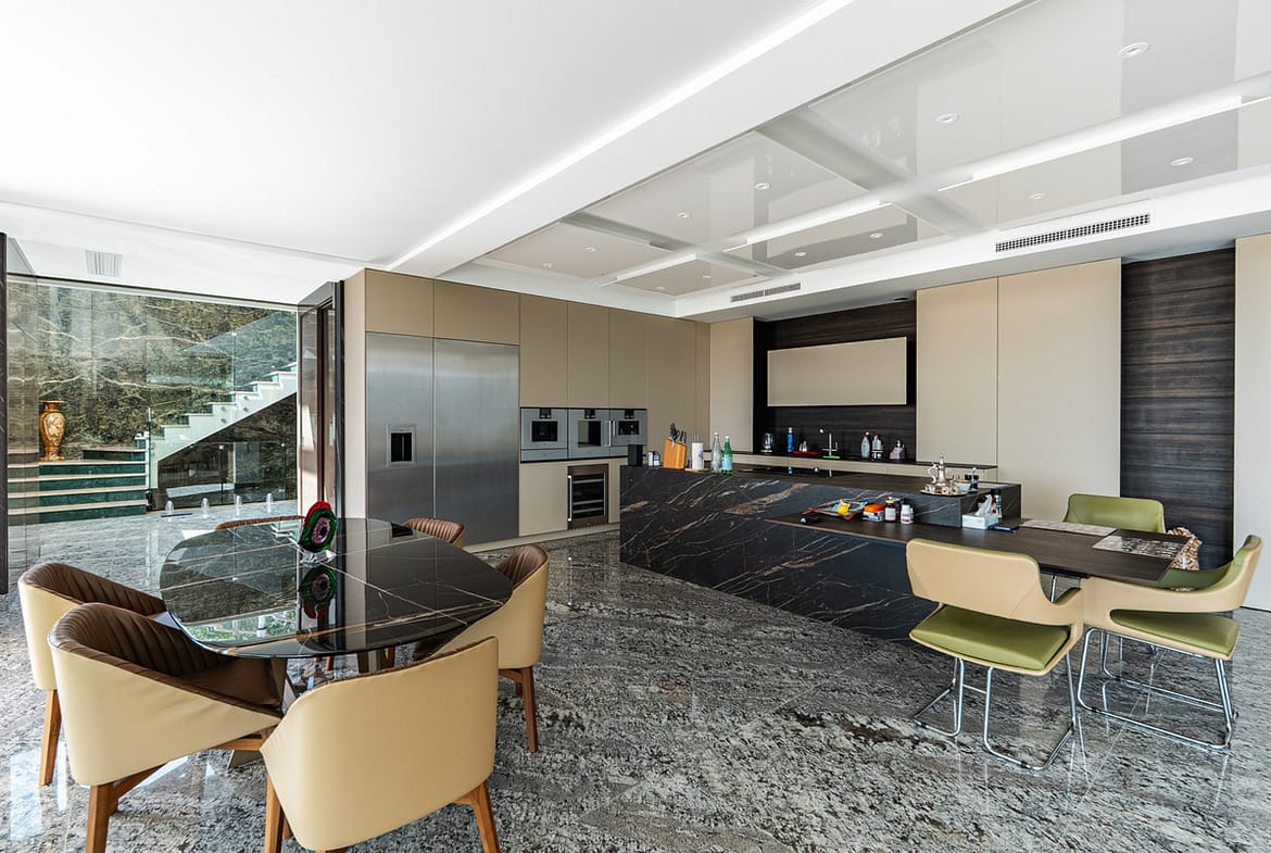 The villa is defined by its exceptional use of premium natural materials. Large-format marble and onyx surfaces create a distinctive and luxurious aesthetic throughout the property.