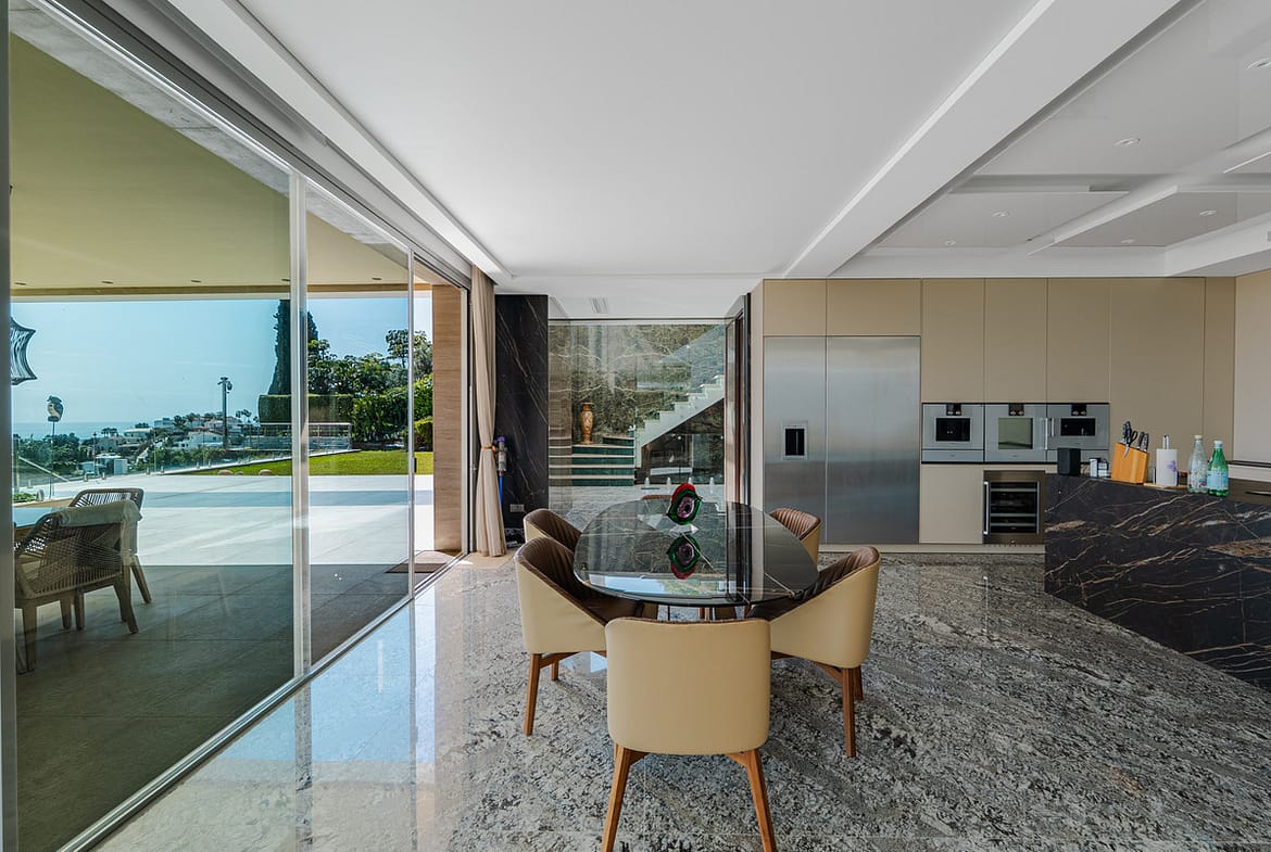 The villa features expansive open-plan interiors where living, dining, and kitchen areas flow seamlessly into one another. Floor-to-ceiling sliding glass doors flood the interiors with natural light while providing direct access to the outdoor terraces.