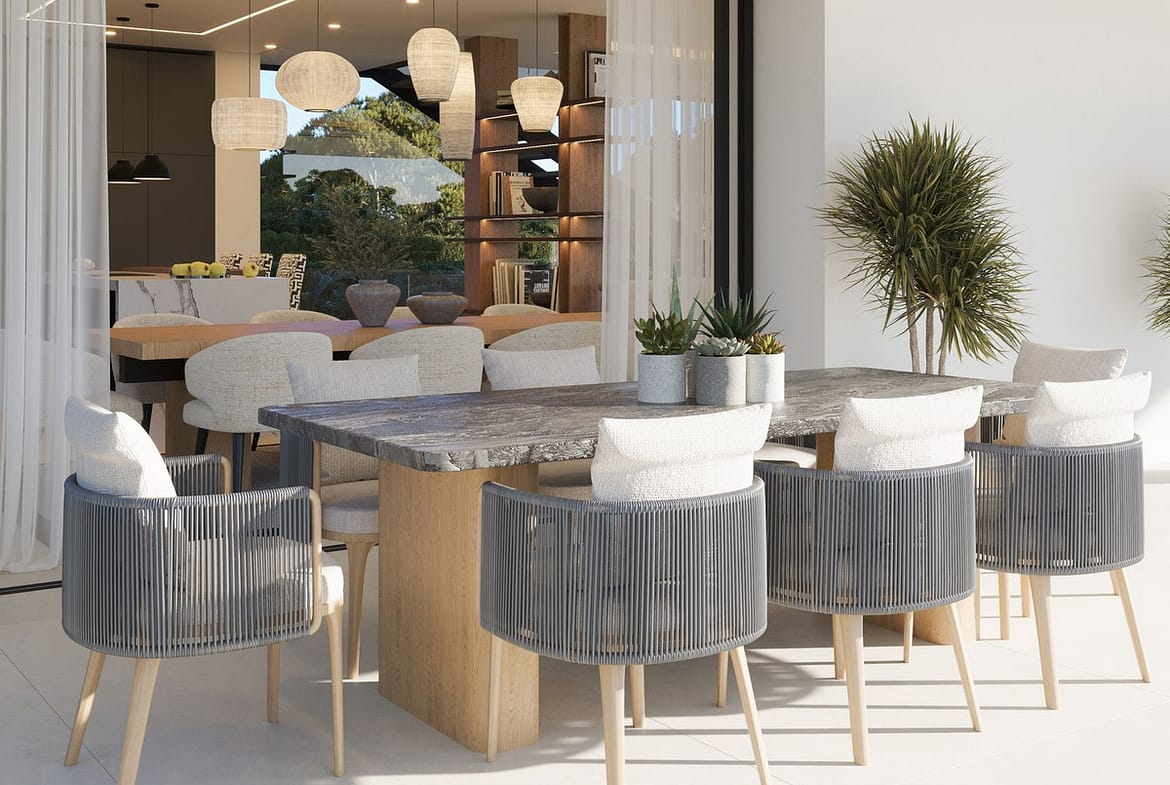 The basement comprises a bedroom with en-suite bathroom, a multipurpose room, a laundry room and a parking area. On the ground floor there is an entrance hall, guest toilet, a bedroom with en-suite bathroom, a spacious living room, dining room and a state-of-the-art open-plan kitchen fully equipped with high-end appliances, offering a functional and attractive space. On the first floor, there is a hallway and three bedrooms with en-suite bathrooms. Finally, the solarium has a jacuzzi and a high-quality outdoor kitchen where you can enjoy the exceptional views of the sea and the golf course (Cabopino Golf), the sunsets and the mountains.