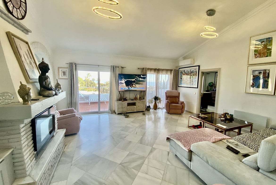 The driveway is extremely spacious and could accommodate several vehicles. This leads to a beautiful entrance to the property.. boasting double doors into a beautiful large light and airy hallway leading to a large lounge boasting hight ceilings, a feature fireplace, two double doors onto a large south facing terrace with incredible sea views. From the Terrace you can access the solarium which has an independent room that would make an additional double bedroom.