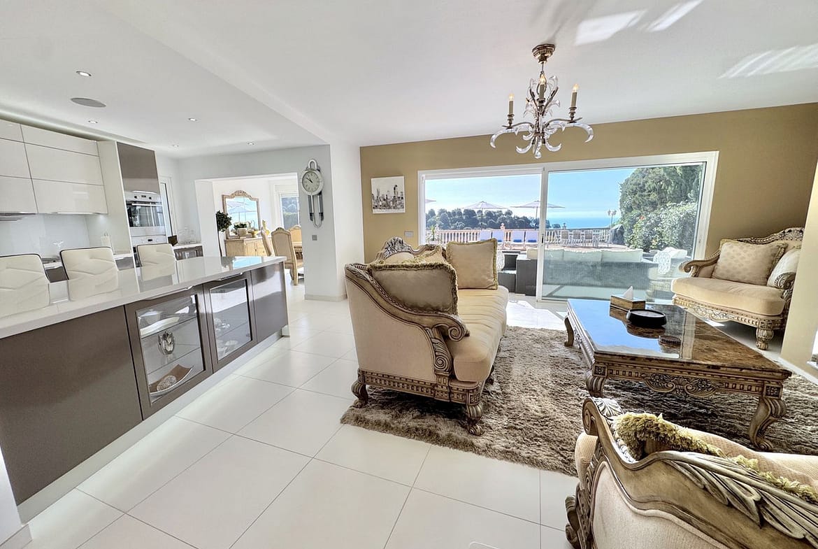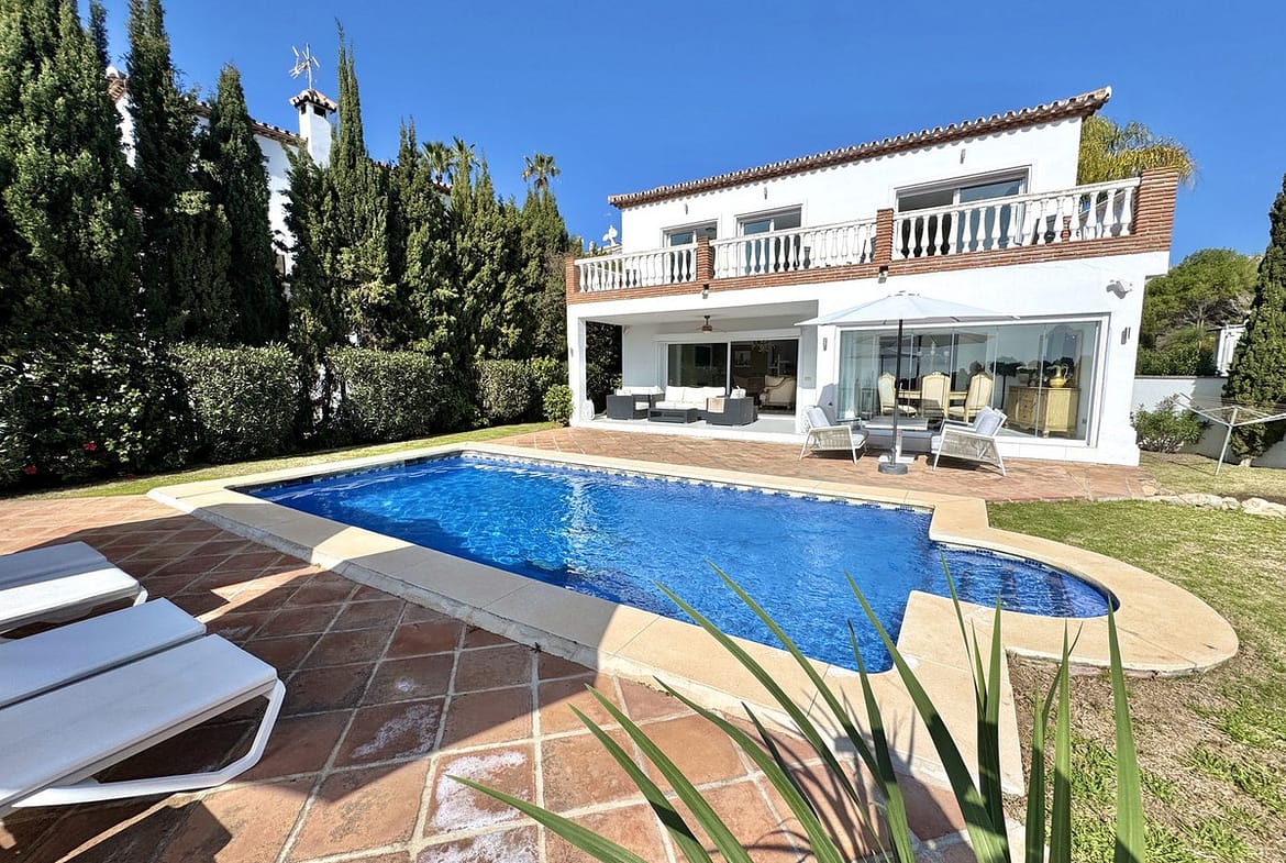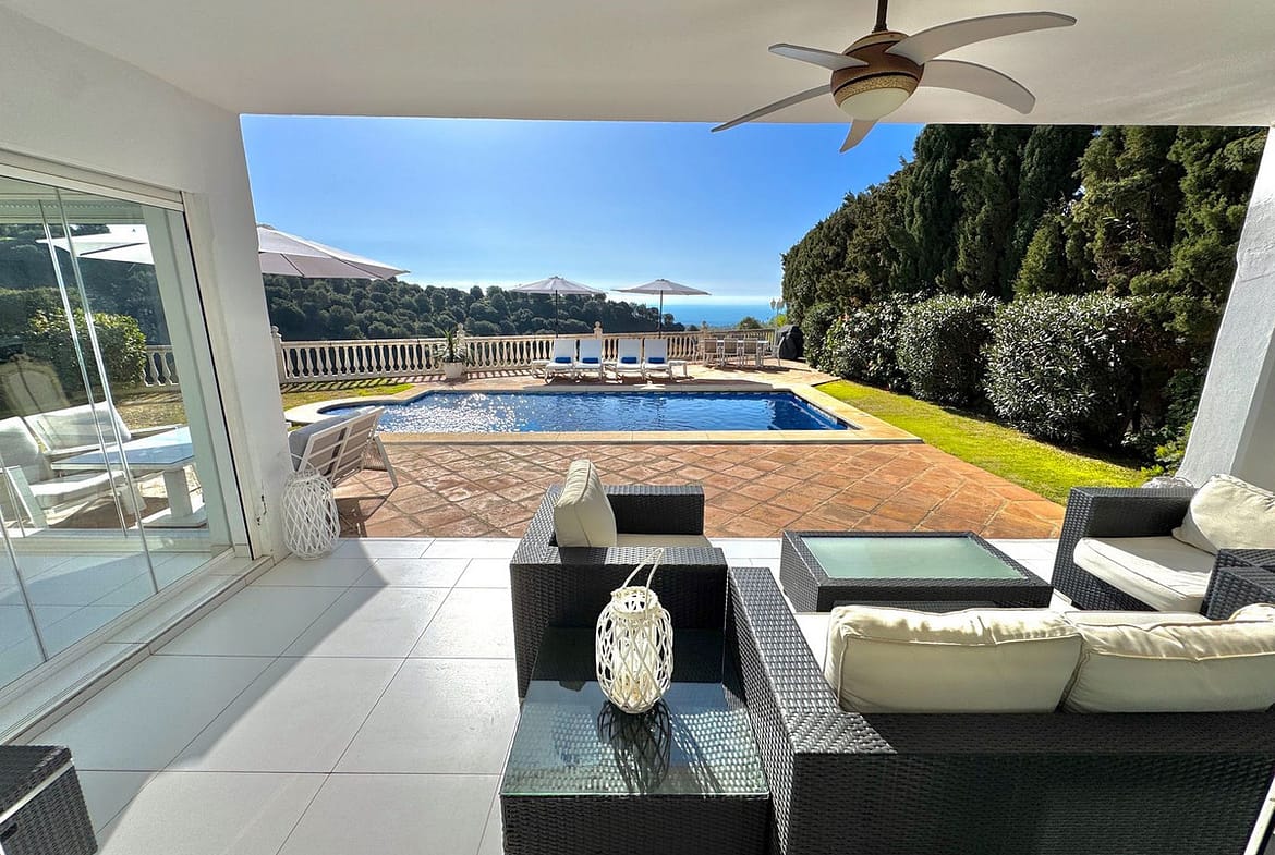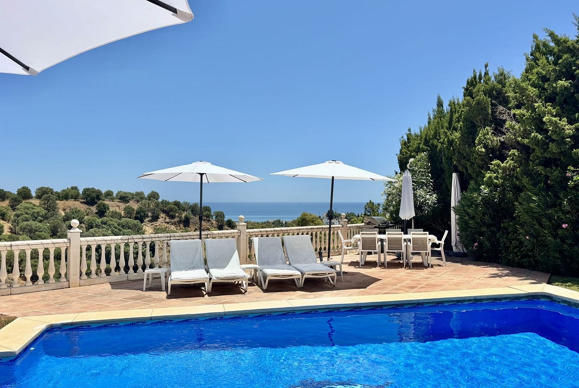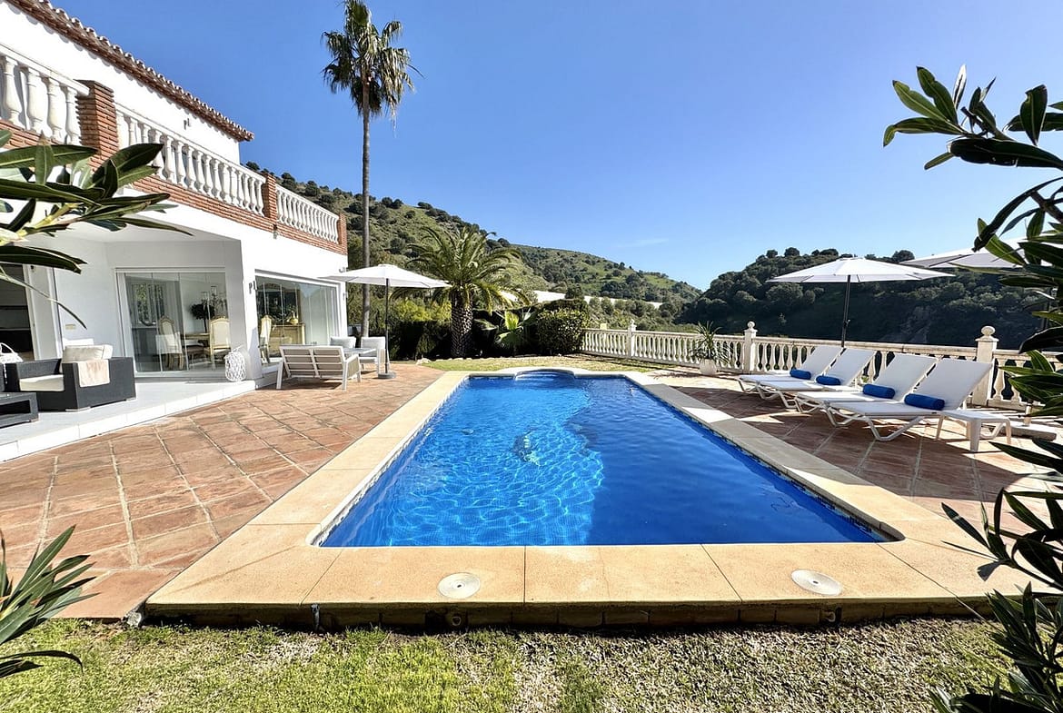 EXCLUSIVE (new Listing) – Lovely 5 bed, 3.5 bath Villa on elevated plot in Upper Calahonda, offering beautiful panoramic views over tree-lined hillside down to the sea.