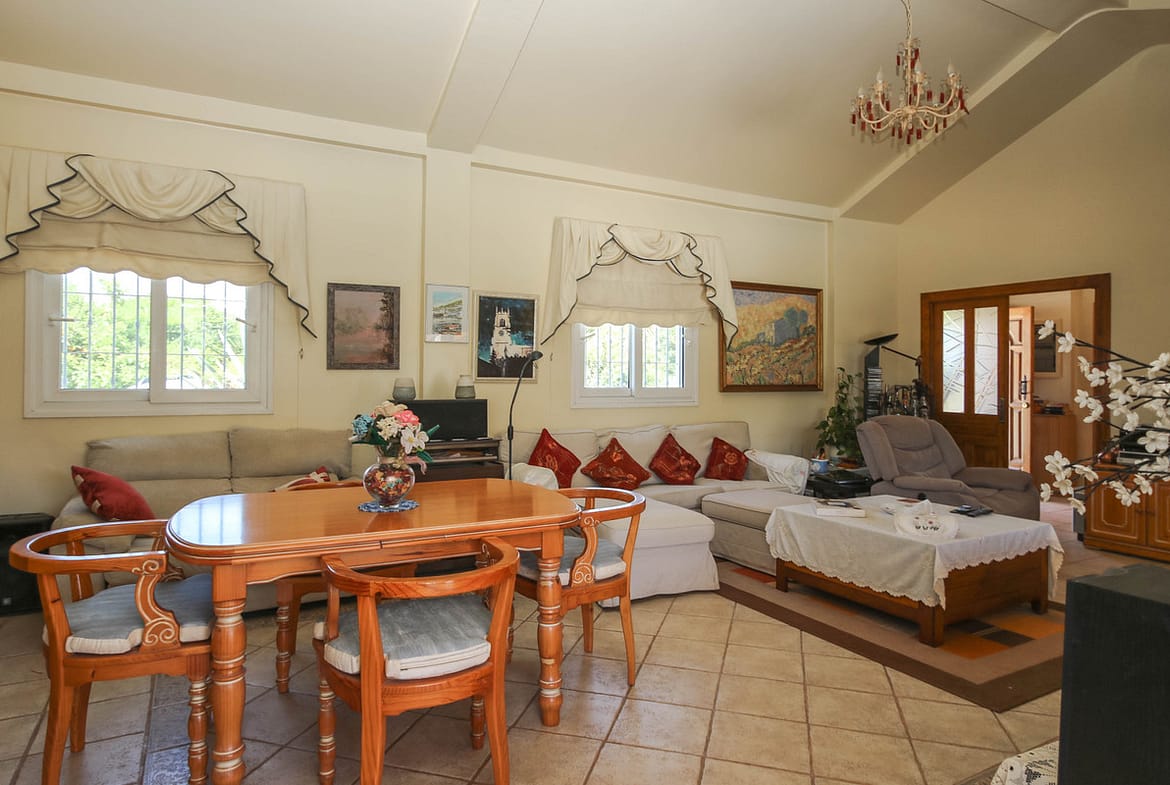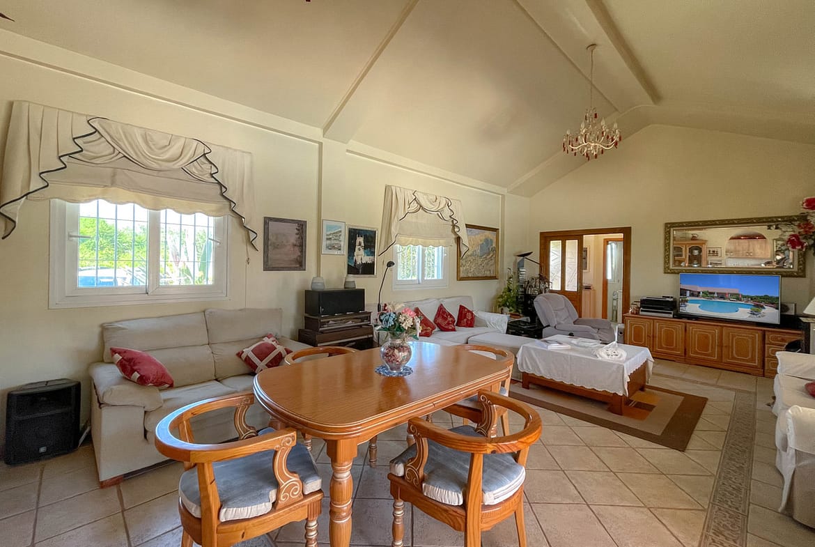 The main residence is impressively spacious, featuring a large living room with patio doors that open onto a shaded terrace—perfect for outdoor dining and relaxation. This area flows directly to the pool and sun terraces. The fully equipped kitchen offers ample storage and is ideally suited for catering to guests.