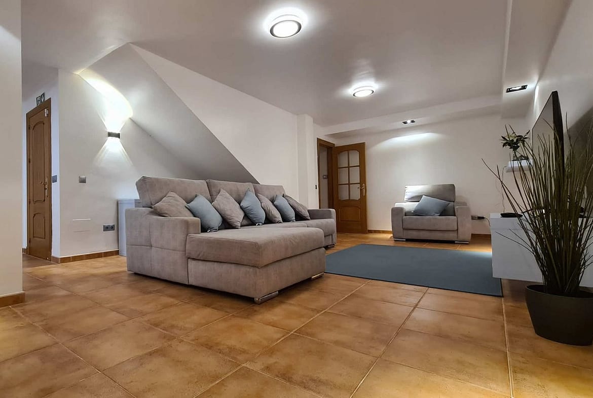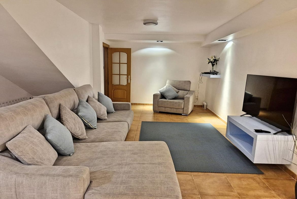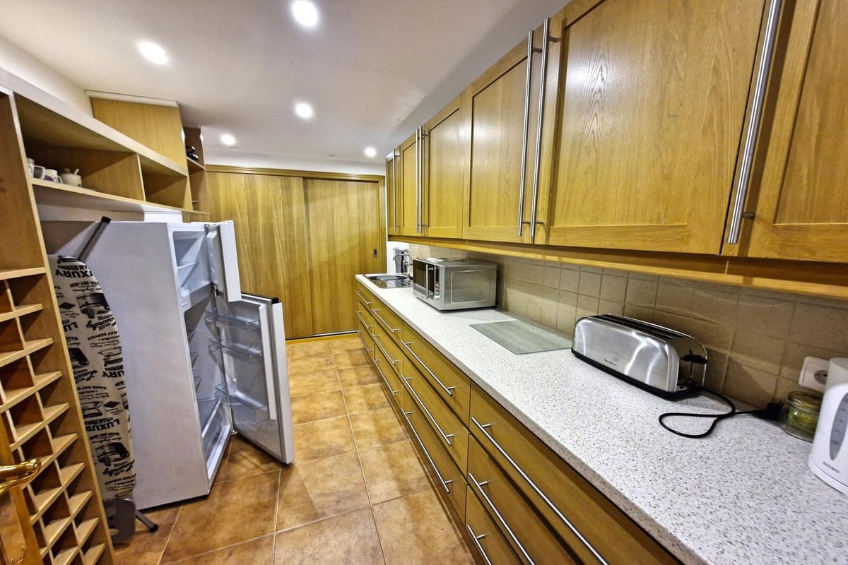 On a corner plot, this impressive & spacious property comprises: Ground floor entrance hallway to bright & spacious living room with access to pool terrace. A quality, modern fully equipped kitchen with breakfast bar and adjoining elegant dining room. Access from the kitchen hallway to a downstairs bathroom, utility room and stairs down to the guest apartment and garage. The basement accommodation contains a living room, kitchen, two large double bedrooms and a bathroom. Access to the apartment is from either the house or the garage, which has a gym area.