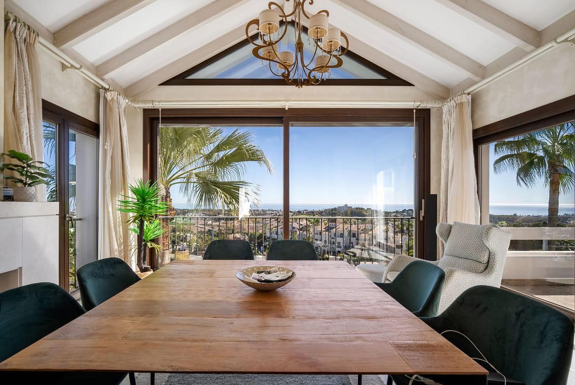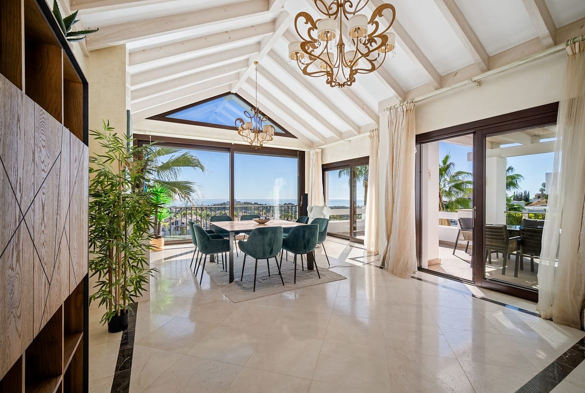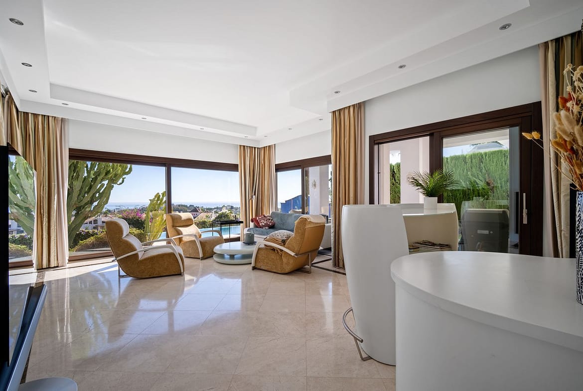 Located in the prestigious gated community of Mirador del Paraiso, this villa boasts breathtaking panoramic sea views. The property is within a very close proximity to renowned golf courses and easy access to Estepona’s myriad restaurants as well as numerous amenities such as shops, a tennis club, International and Spanish schools as well as public and private health services. The beach is only a short drive away and Malaga airport is an approximate 50 mins drive.