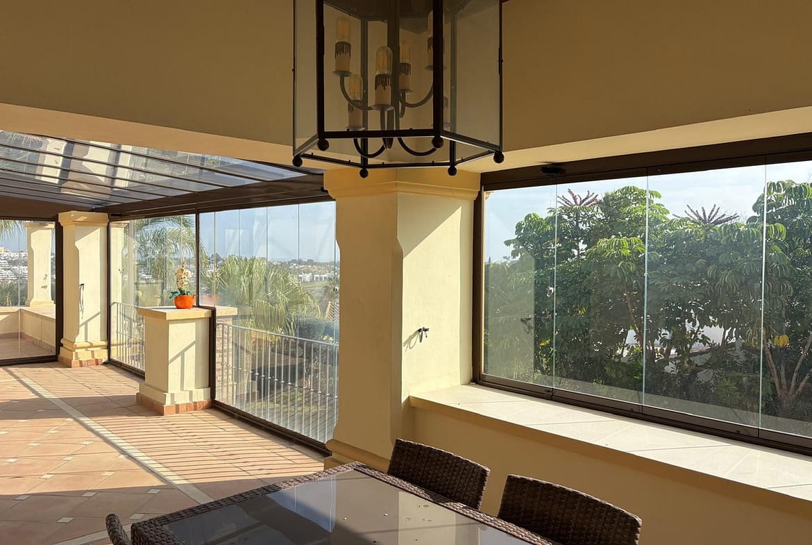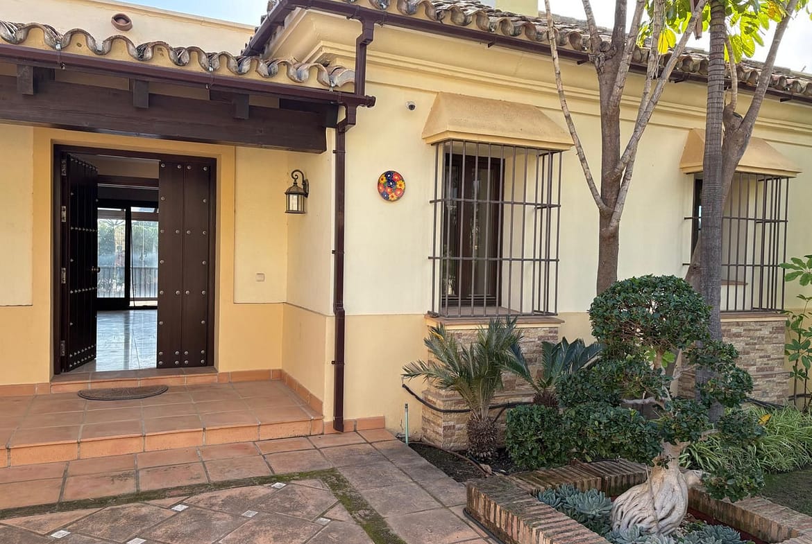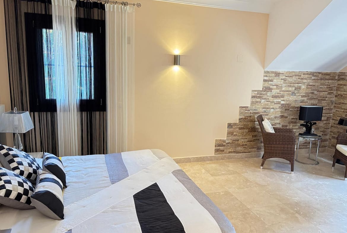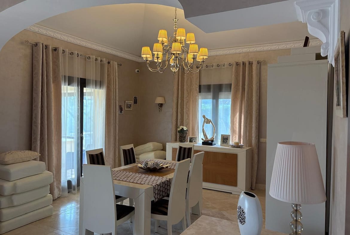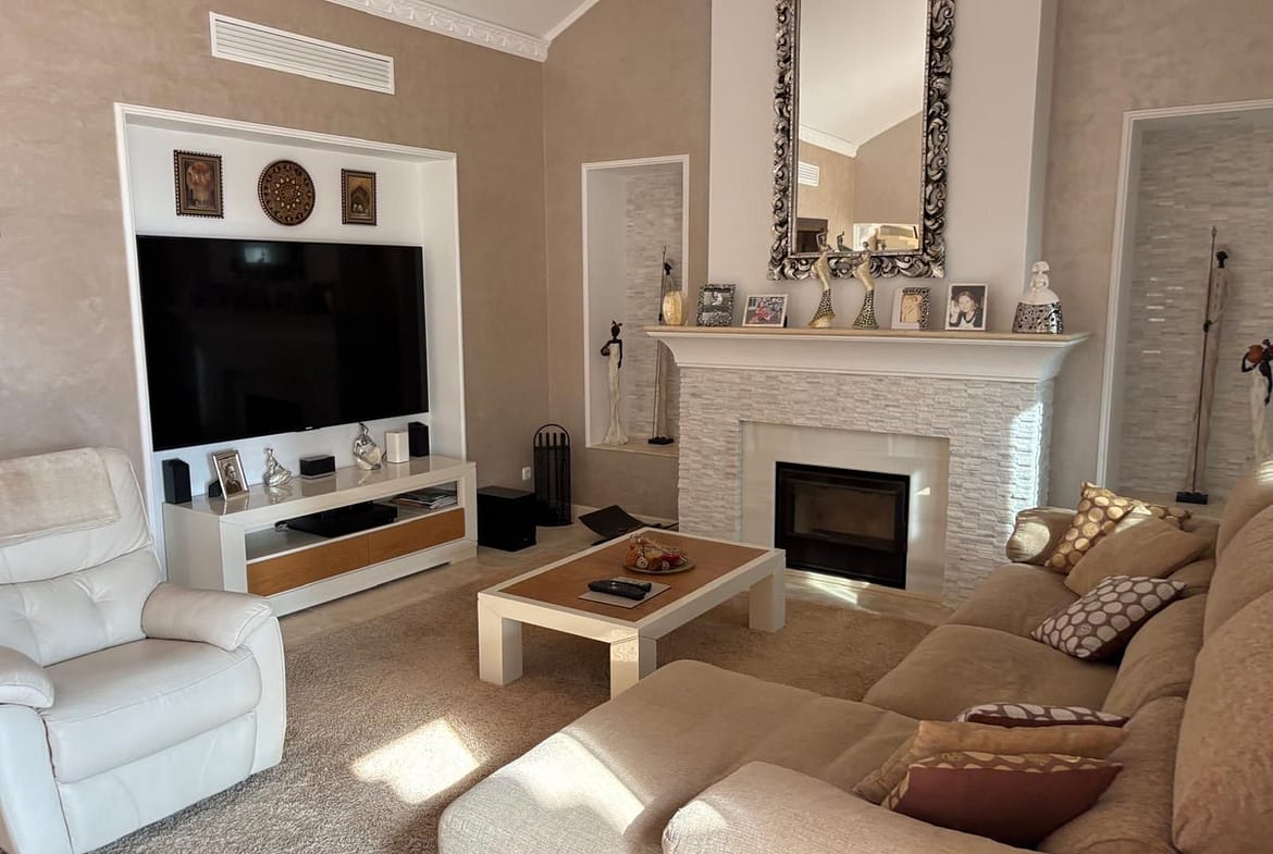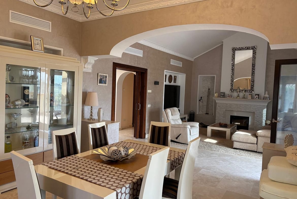 The entrance leads to a cozy foyer, which opens up to a spacious living room. To the right, there is a dining area with access to the modern kitchen, and to the left, there is a relaxation area with a fireplace room, a comfortable sofa, and a television. From the living room, you can step out onto a large, enclosed terrace with stunning views of the golf course, the sea, as well as the private garden and pool. Thanks to the southern orientation, the house is filled with sunlight throughout the day.