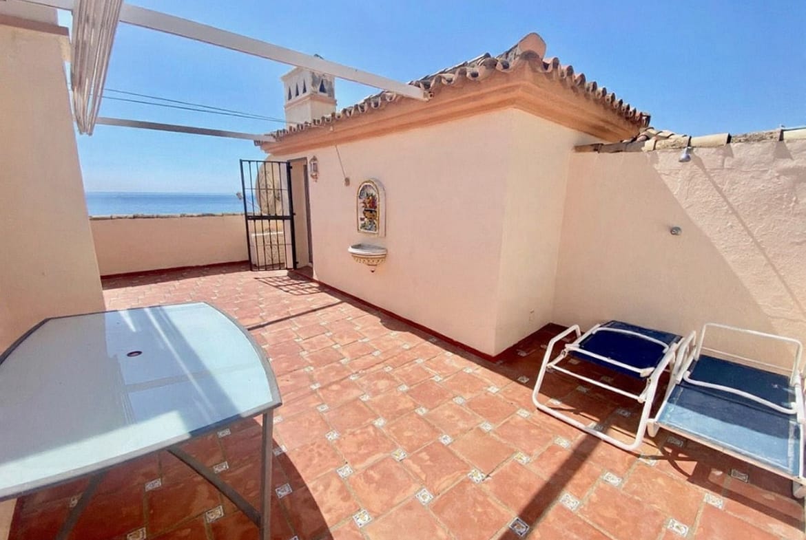 Well-designed and spacious townhouse for sale in Belgravia Club – one of Estepona’s most sought-after frontline developments, offering truly spectacular and unobstructed sea views from several bedrooms and terraces. Here you live right by the sea and enjoy a separate guest studio, providing additional living space completely independent from the main home. It also offers a communal pool, beautifully maintained gardens, and an exclusive clubhouse with four guest rooms that residents can book. Rentals are permitted, making the property ideal both as a home and as an investment.