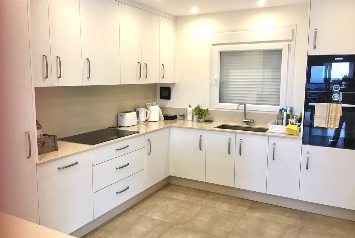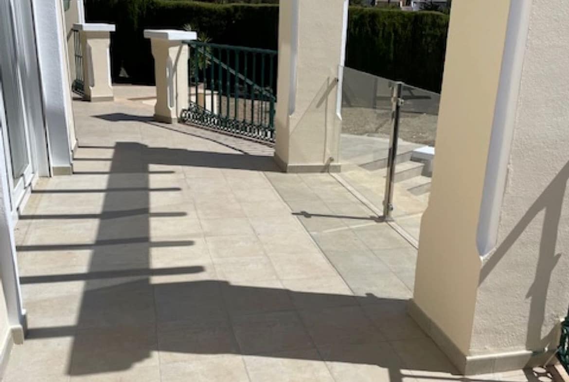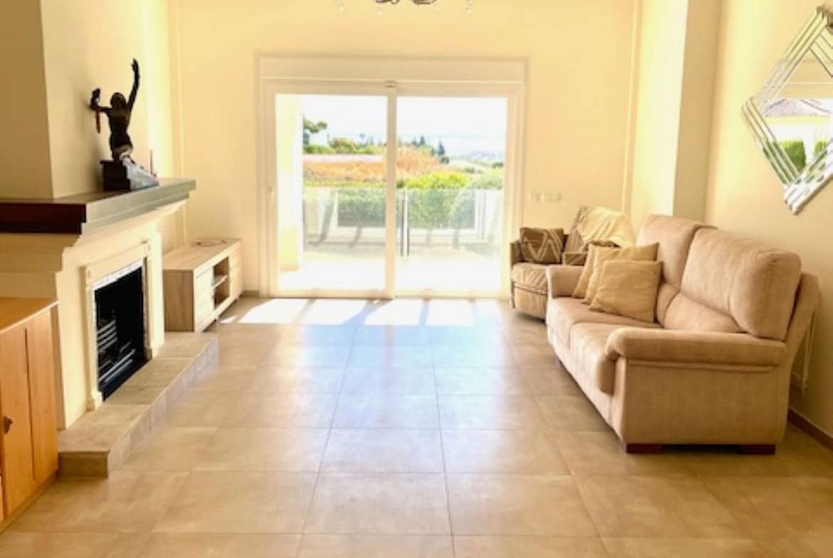 The large living room of approximately 50M2 has an open fire place, fully air-conditioned hot and cold throughout the house, large kitchen diner with a utility room, from the living room and kitchen you can access the wrap around terrace, and part of the terrace has been covered to give shade in the summer time. Again, you have sea views from the living room and terrace.