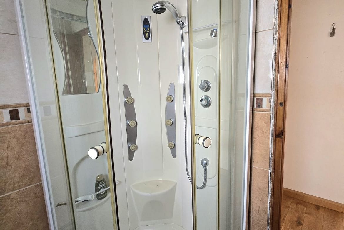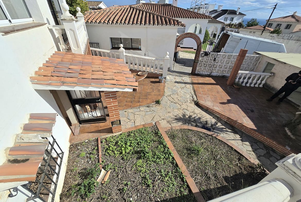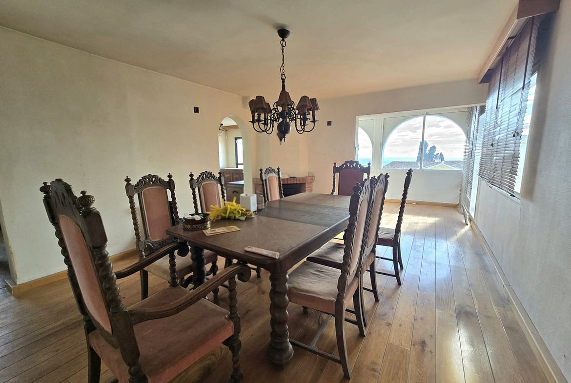 The main home has two entrances and several parking spaces, two of them covered. Inside, it offers three bedrooms, two bathrooms, a separate kitchen, a large living room, and a glazed terrace with sea views, ideal for year-round enjoyment.
