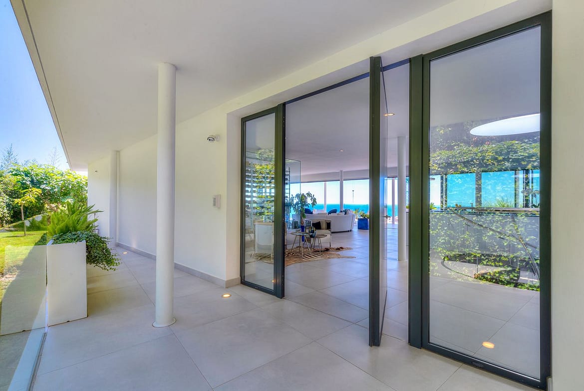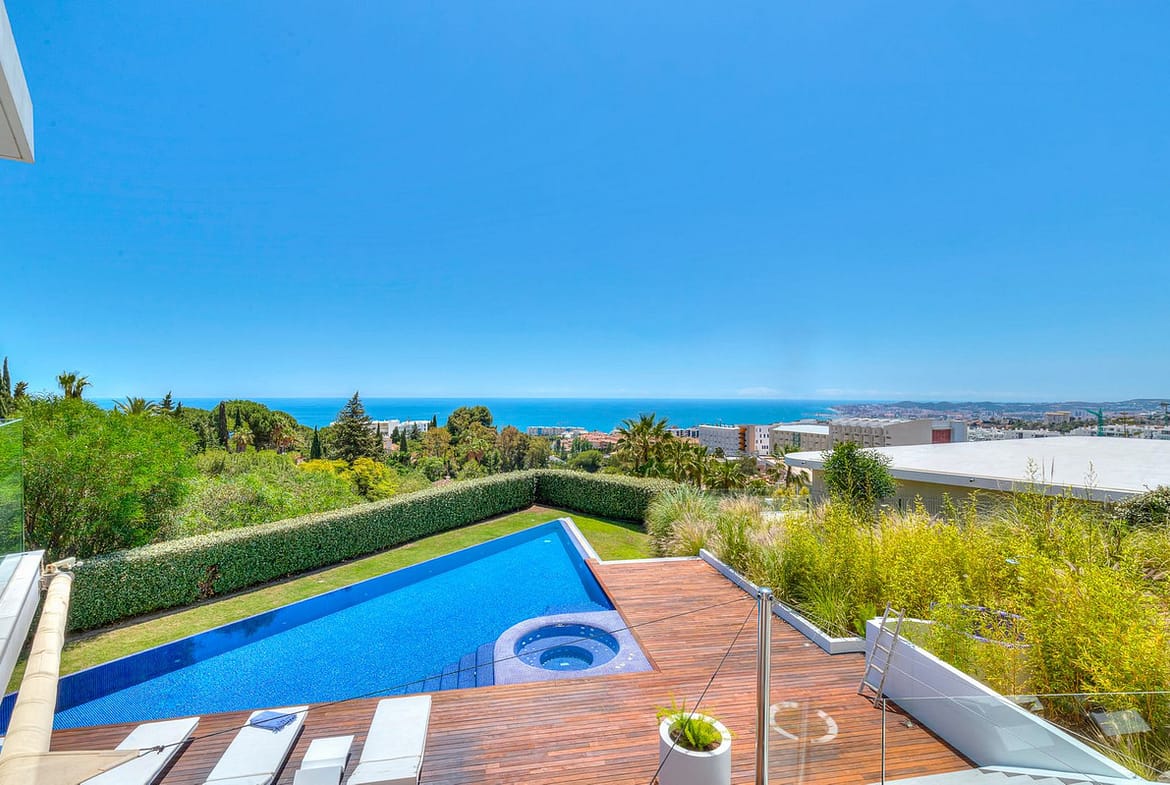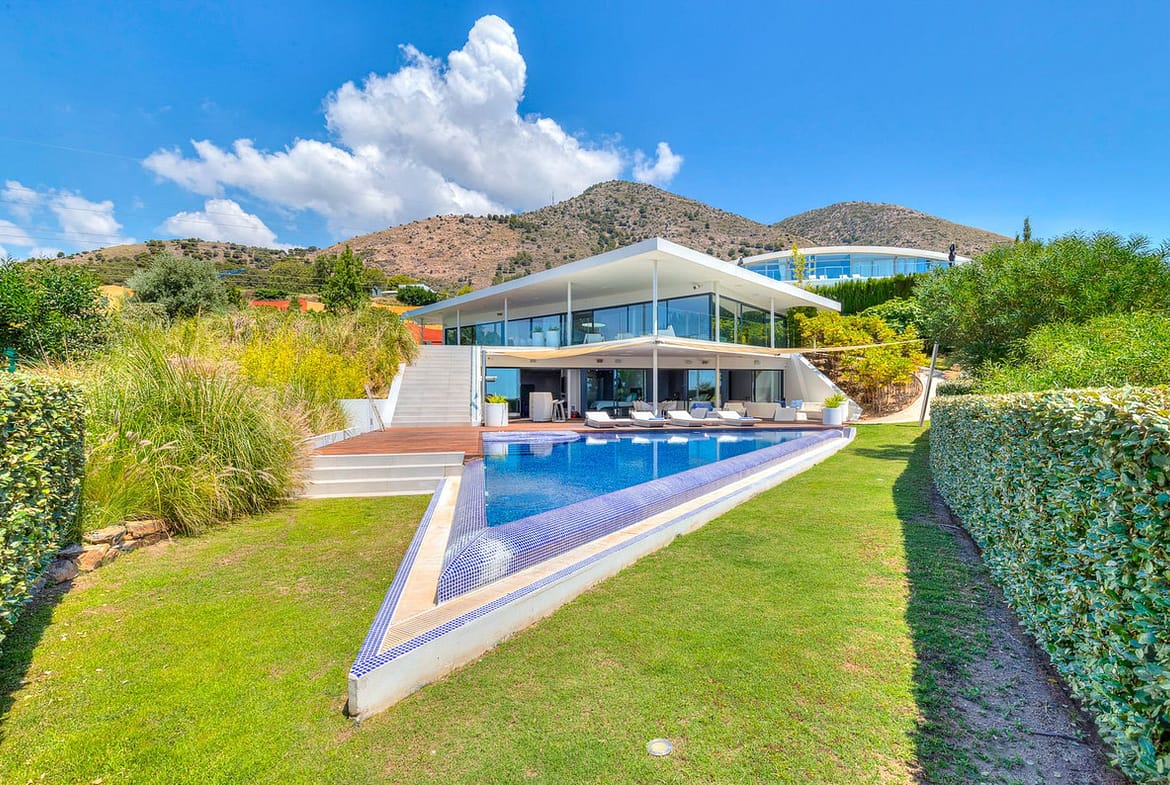 Contemporary designer villa with breathtaking views towards the sea. The villa comprises of two floors with main entrance on the upper level. From the moment you step through the front door, you are struck by the fantastic view thanks to the floor-to-ceiling glass doors along the whole front side of the house. The upper floor is characterized by an open floor plan that houses a kitchen island, integrated kitchen cabinets, dining area and sofa group. In the middle sits a glass wine cabinet. On this floor is also the master bedroom with bathroom en-suite and private dressing room. Outside the large glass doors is a lovely covered terrace that leads out to a wooden deck and lawn. From the wooden deck, a three-meter-wide staircase leads down to the 67 m2 pool with Jacuzzi. The villa's two floors are connected by the specially designed staircase, which is the jewel of the house. On the lower level there are four bedrooms, each with an en-suite bathroom with glass walls, a guest toilet, a TV-room with a small kitchen and a fireplace, a laundry room and a large double garage. Three of the four bedrooms and the TV-room have access to the wooden deck next to the pool where, in addition to space for sun loungers and a dining table, there is an outdoor kitchen, barbecue and toilet, all protected by roll-up canvas roofs. The villa is equipped with air conditioning, under floor heating, alarms, security cameras, home automation, etc. The villa is located on one of the best plots in the exclusive Reserva del Higueron urbanization on the border between Fuengirola and Benalmadena only 15 minutes from Malaga International Airport. In the area there is the 5-star Hotel Hilton, sports club with gym, spa, padel and tennis courts and a Michelin restaurant.