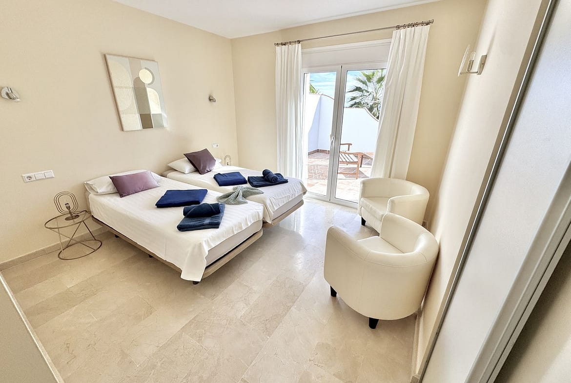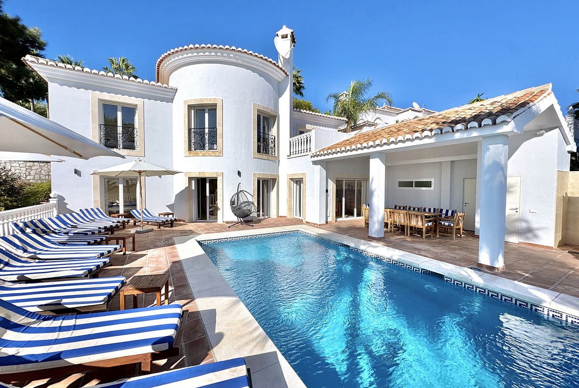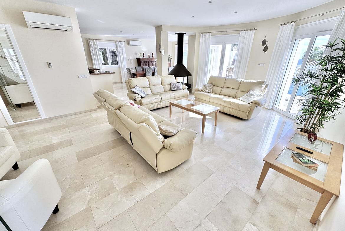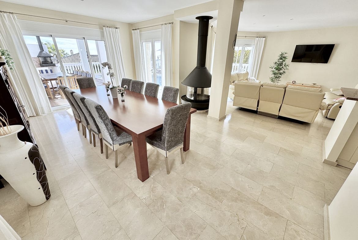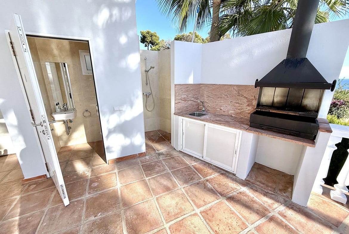 This substantial south facing detached villa sits on a beautiful elevated corner plot in a quiet and sought after exclusive residential community, just 250m from the beach. You are also only approx 22 mins walk to La Cala’s main shopping / restaurant Boulevard. You enter the luxury development via impressive high electric double opening gates. The attractive and classy villa offers 5 spacious master bedrooms all with their own luxury ensuite bath or shower rooms and fitted wardrobes. The main level has a spacious open-plan layout, seamlessly connecting the living room, dining room and modern open plan kitchen. This amazing villa for sale also has an extra enormous entertaining area below the villa with windows, giving potential for a gym & cinema room or possibly even a guest apartment. The detached villa also has a good size garage area, hot & cold air-con, double glazing, outside BBQ kitchen, outside shower & toilet with sink, amazing outside covered entertaining area with high vaulted ceilings and the beautiful open patio garden / swimming pool area, all offering beautiful Mediterranean sea views. From the patio garden there is also a small lawned garden area. The exclusive gated community that this detached villa is set in, also features extensive beautifully landscaped gardens with a petanque / boules court and a putting green.